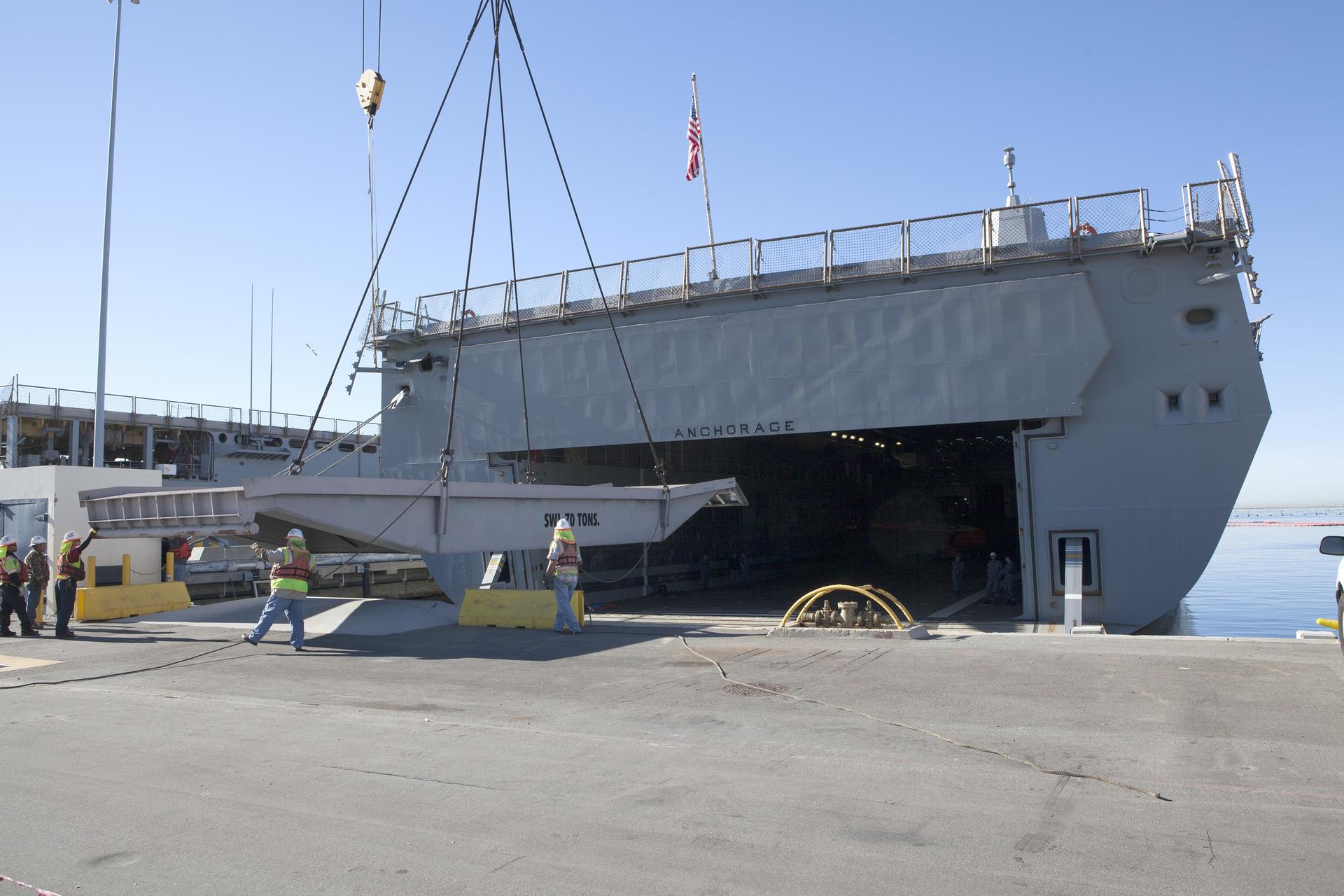 SAN DIEGO, Calif. – A ramp is being loaded on the USS Anchorage so that ground support equipment for use during recovery of the Orion crew module after its first flight test can be loaded into the well deck of the ship at Naval Base San Diego in California. Before launch of Orion on a Delta IV Heavy rocket from Cape Canaveral Air Force Station in Florida, NASA, Lockheed Martin and U.S. Navy personnel will head out to sea in the USS Anchorage and the USNS Salvor, a salvage ship, and wait for splashdown of the Orion crew module in the Pacific Ocean. The Ground Systems Development and Operations Program will lead the recovery efforts. Orion is the exploration spacecraft designed to carry astronauts to destinations not yet explored by humans, including an asteroid and Mars. It will have emergency abort capability, sustain the crew during space travel and provide safe re-entry from deep space return velocities. The first unpiloted flight test of Orion is scheduled to launch in December atop a United Launch Alliance Delta IV Heavy rocket and in 2018 on NASA’s Space Launch System rocket. For more information, visit http://www.nasa.gov/orion. Photo credit: NASA/Dimitri Gerondidakis