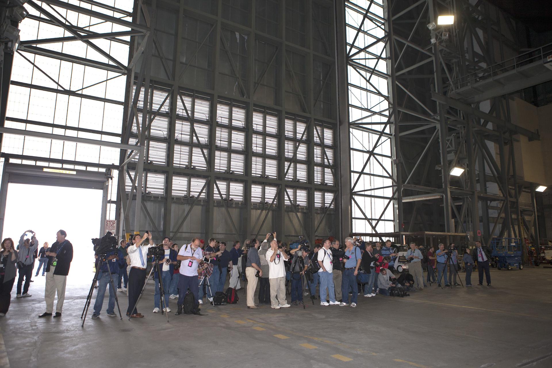 CAPE CANAVERAL, Fla. – At NASA's Kennedy Space Center in Florida, members of the news media tour the spaceport's Vehicle Assembly Building VAB. Like the Apollo Saturn V and space shuttles of the past, the Space Launch System rocket will be stacked and checked out in the VAB prion to being rolled to the launch pad. Orion is the exploration spacecraft designed to carry astronauts to destinations not yet explored by humans, including an asteroid and Mars. It will have emergency abort capability, sustain the crew during space travel and provide safe re-entry from deep space return velocities. The first unpiloted flight test of Orion is scheduled to launch Dec. 4, 2014 atop a United Launch Alliance Delta IV Heavy rocket, and in 2018 on NASA’s Space Launch System rocket. For more information, visit www.nasa.gov/orion Photo credit: NASA/Kim Shiflett