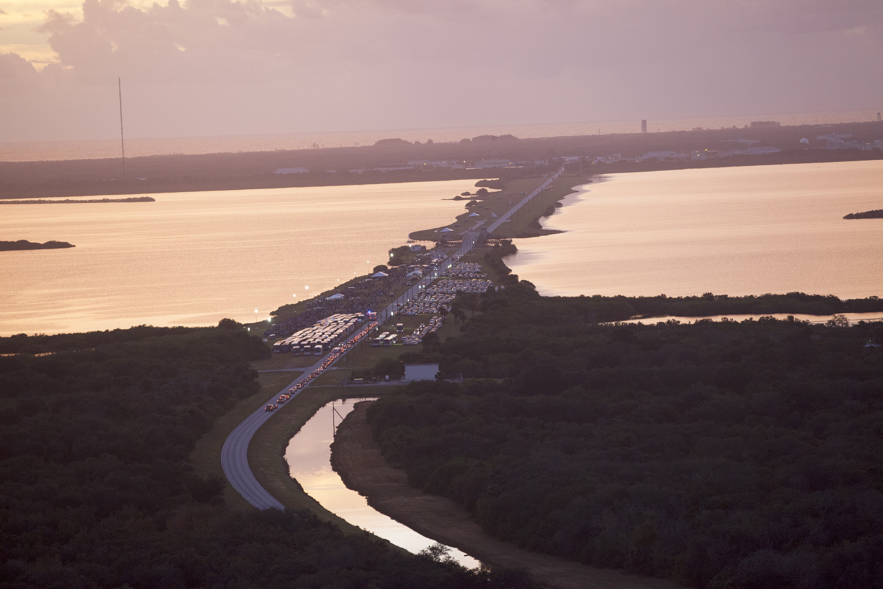 CAPE CANAVERAL, Fla. – This helicopter view of the NASA Causeway connecting NASA's Kennedy Space Center with Cape Canaveral Air Force Staton shows the thousands of vehicles parked where guests gather to see the launch of the Orion Flight Test. The liftoff was postponed because of an issue related to fill and drain valves on the Delta IV Heavy rocket that teams could not troubleshoot by the time the launch window expired. For more information, visit www.nasa.gov/orion Photo credit: NASA/Kim Shiflett