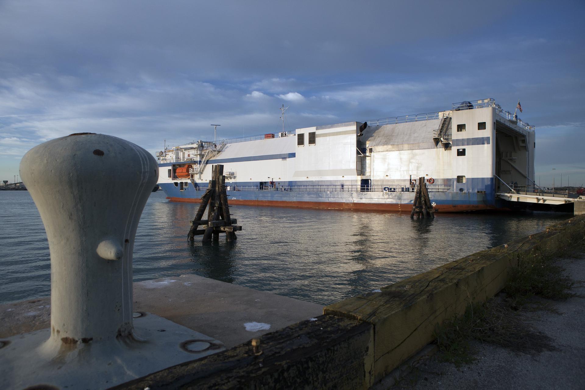 CAPE CANAVERAL, Fla. – The United Launch Alliance Delta Mariner arrives at Port Canaveral to deliver the Atlas V rocket that will be used to launch NASA's Magnetospheric Multiscale mission. To learn about the MMS, go to http://go.nasa.gov/1GUbzxb. Photo credit: NASA/Ben Smegelsky
