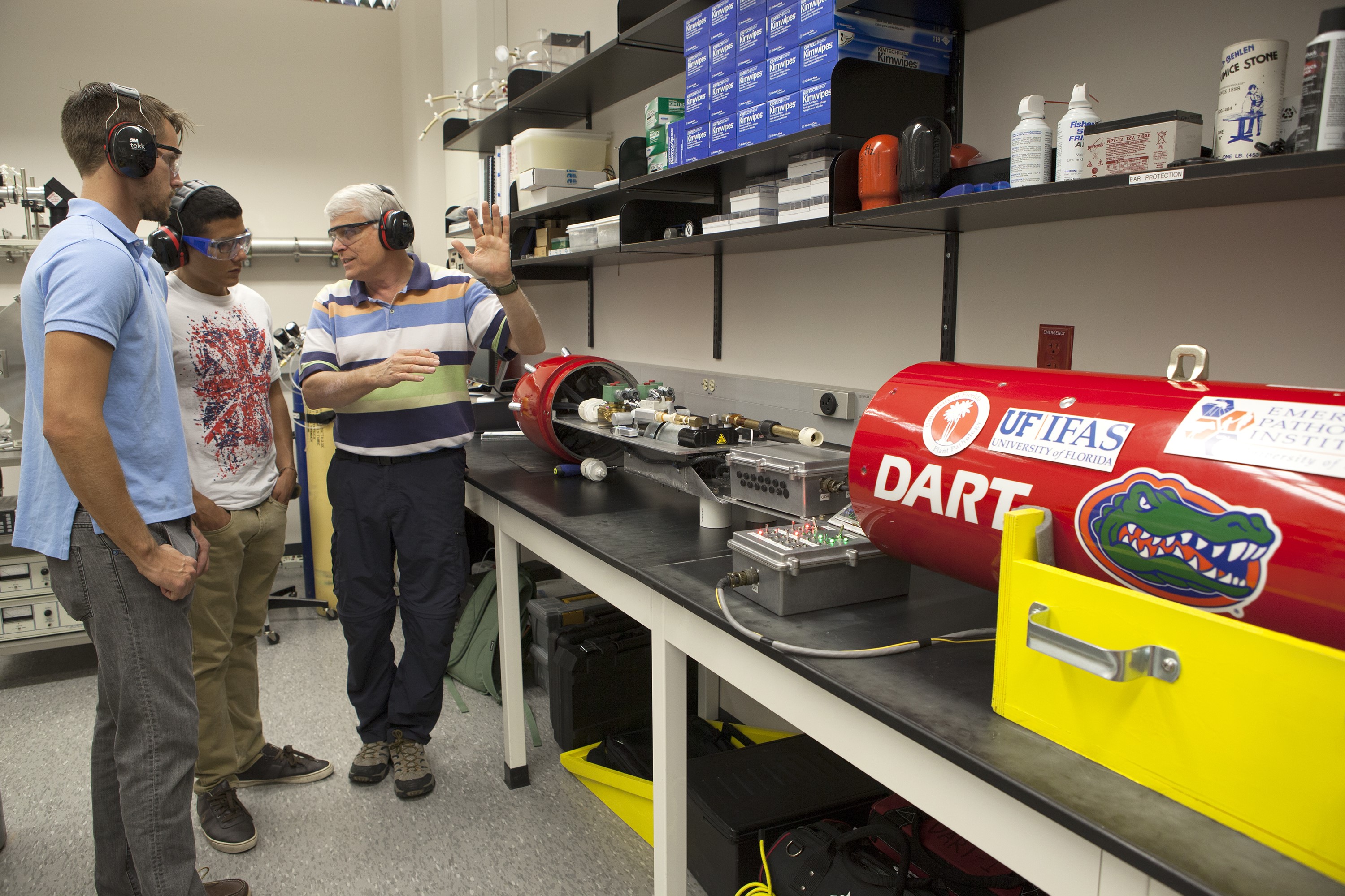 CAPE CANAVERAL, Fla. – Researchers at NASA’s Kennedy Space Center in Florida check readings on the Dust Atmospheric Recovery Technology, or DART, spacecraft inside a laboratory at the Space Life Sciences Lab. DART will characterize the dust loading and microbial diversity in the atmosphere over Florida during summer months with a special emphasis on their interactions during an African dust storm. DART will be used to collect atmospheric aerosols and suspended microbial cells over Florida and Kennedy. Results will help predict the risks of excessive microbial contamination adhering to spacecraft surfaces. Photo credit: NASA/Dimitri Gerondidakis