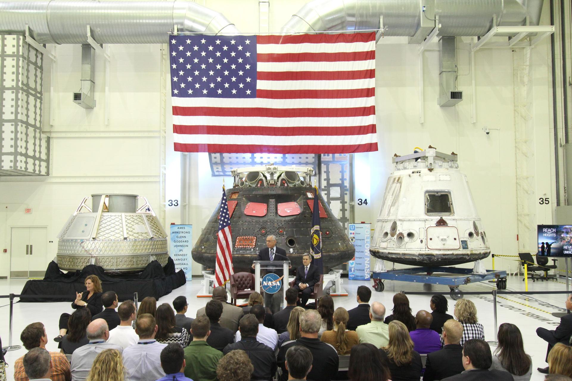 CAPE CANAVERAL, Fla. – In the Neil Armstrong Operations and Checkout Building high bay at NASA's Kennedy Space Center in Florida, NASA Administrator Charlie Bolden delivers a “state of the agency” address at NASA's televised fiscal year 2016 budget rollout event. Kennedy Space Center Director Bob Cabana, seated, made the opening remarks. Representatives from the Kennedy workforce, news media and social media were in attendance. NASA's Orion, SpaceX Dragon and Boeing CST-100 spacecraft, all destined to play a role in NASA’s overall exploration objectives, were on display. For information on NASA's budget, visit http://www.nasa.gov/budget. Photo credit: NASA/Amber Watson