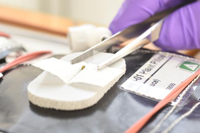 Astronaut Scott Kelly initiated VEG-01 B, the second crop of lettuce, on July, 8, 2015, and both Kelly and Astronaut Kjell Lindgren cared for the plants. The crop grew for 33 days. VEG-01 B included one set of six plant pillows planted with red romaine lettuce seeds. On Aug. 10, 2015, the crew harvested and consumed leaves from each plant. This was the first crop grown and consumed in NASA hardware. They harvested the rest of the plant tissue and froze it in the station’s Minus Eighty-Degree Laboratory Freezer for ISS (MELFI) for return to Earth for further study including microbial analysis, antioxidant capacity, mineral analysis and anthocyanin concentration.
