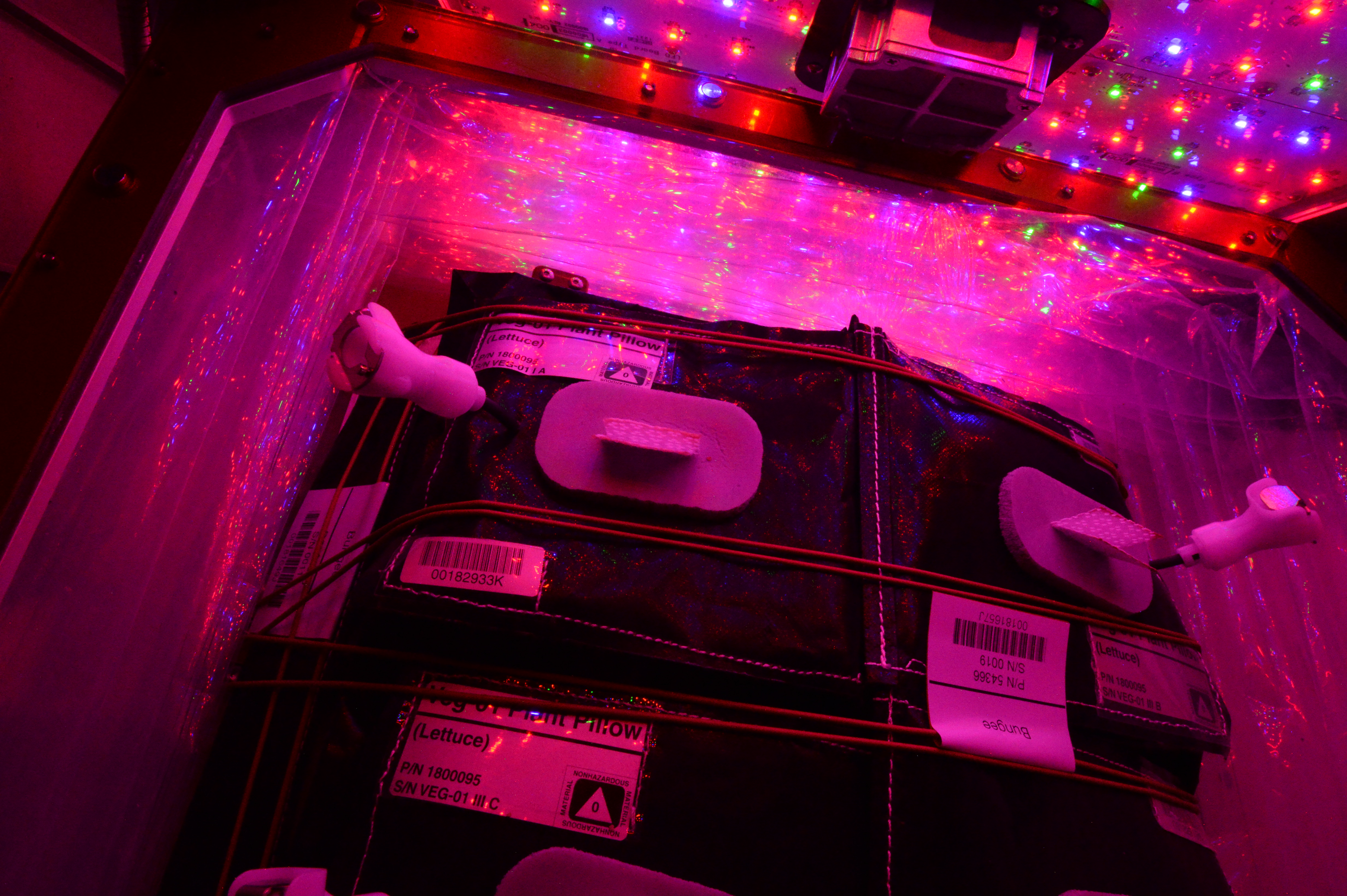 Astronaut Scott Kelly initiated VEG-01 B, the second crop of lettuce, on July, 8, 2015, and both Kelly and Astronaut Kjell Lindgren cared for the plants. The crop grew for 33 days. VEG-01 B included one set of six plant pillows planted with red romaine lettuce seeds. On Aug. 10, 2015, the crew harvested and consumed leaves from each plant. This was the first crop grown and consumed in NASA hardware. They harvested the rest of the plant tissue and froze it in the station’s Minus Eighty-Degree Laboratory Freezer for ISS (MELFI) for return to Earth for further study including microbial analysis, antioxidant capacity, mineral analysis and anthocyanin concentration.