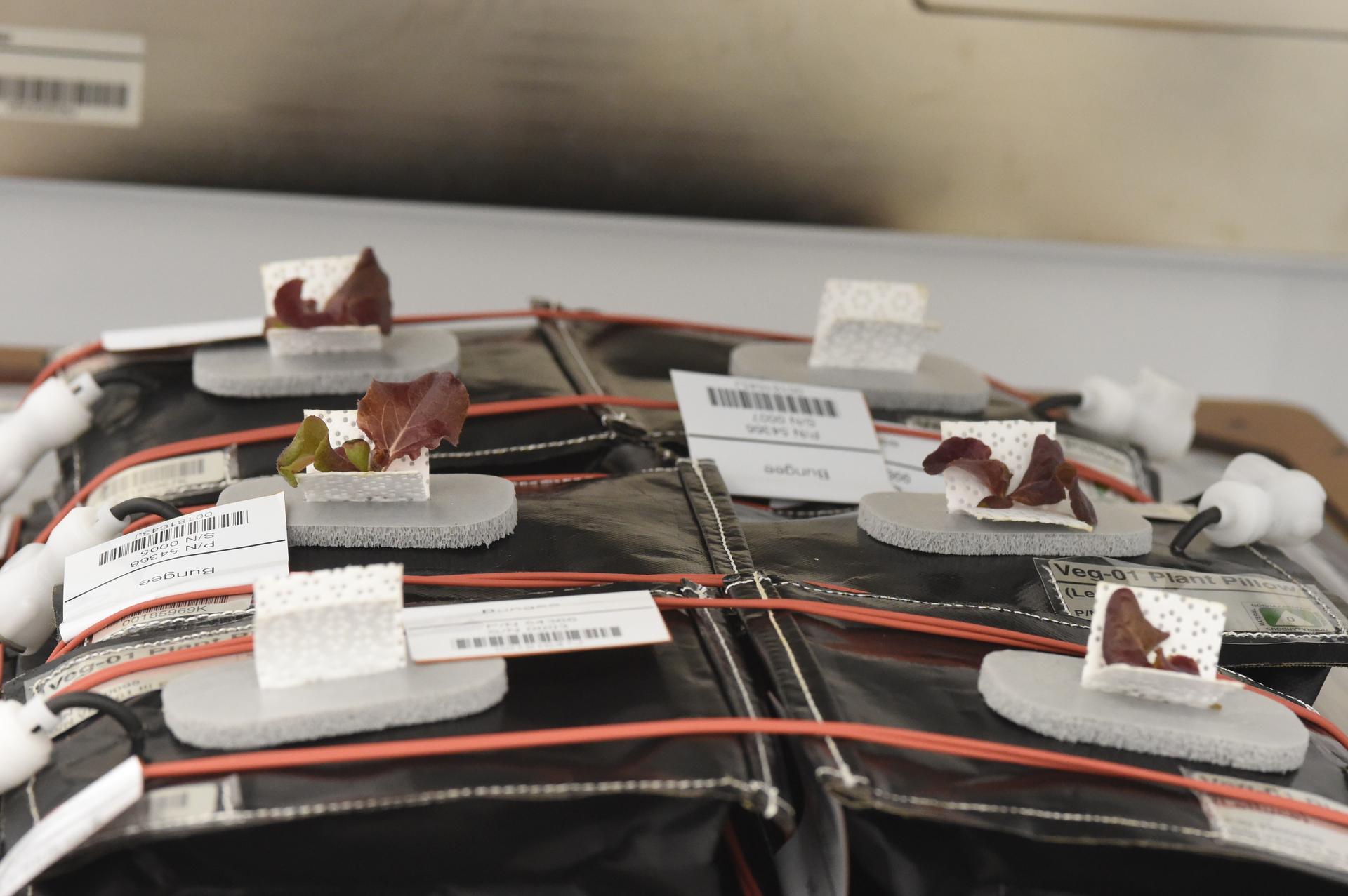 Astronaut Scott Kelly initiated VEG-01 B, the second crop of lettuce, on July, 8, 2015, and both Kelly and Astronaut Kjell Lindgren cared for the plants. The crop grew for 33 days. VEG-01 B included one set of six plant pillows planted with red romaine lettuce seeds. On Aug. 10, 2015, the crew harvested and consumed leaves from each plant. This was the first crop grown and consumed in NASA hardware. They harvested the rest of the plant tissue and froze it in the station’s Minus Eighty-Degree Laboratory Freezer for ISS (MELFI) for return to Earth for further study including microbial analysis, antioxidant capacity, mineral analysis and anthocyanin concentration.
