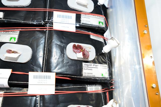 Astronaut Scott Kelly initiated VEG-01 B, the second crop of lettuce, on July, 8, 2015, and both Kelly and Astronaut Kjell Lindgren cared for the plants. The crop grew for 33 days. VEG-01 B included one set of six plant pillows planted with red romaine lettuce seeds. On Aug. 10, 2015, the crew harvested and consumed leaves from each plant. This was the first crop grown and consumed in NASA hardware. They harvested the rest of the plant tissue and froze it in the station’s Minus Eighty-Degree Laboratory Freezer for ISS (MELFI) for return to Earth for further study including microbial analysis, antioxidant capacity, mineral analysis and anthocyanin concentration.