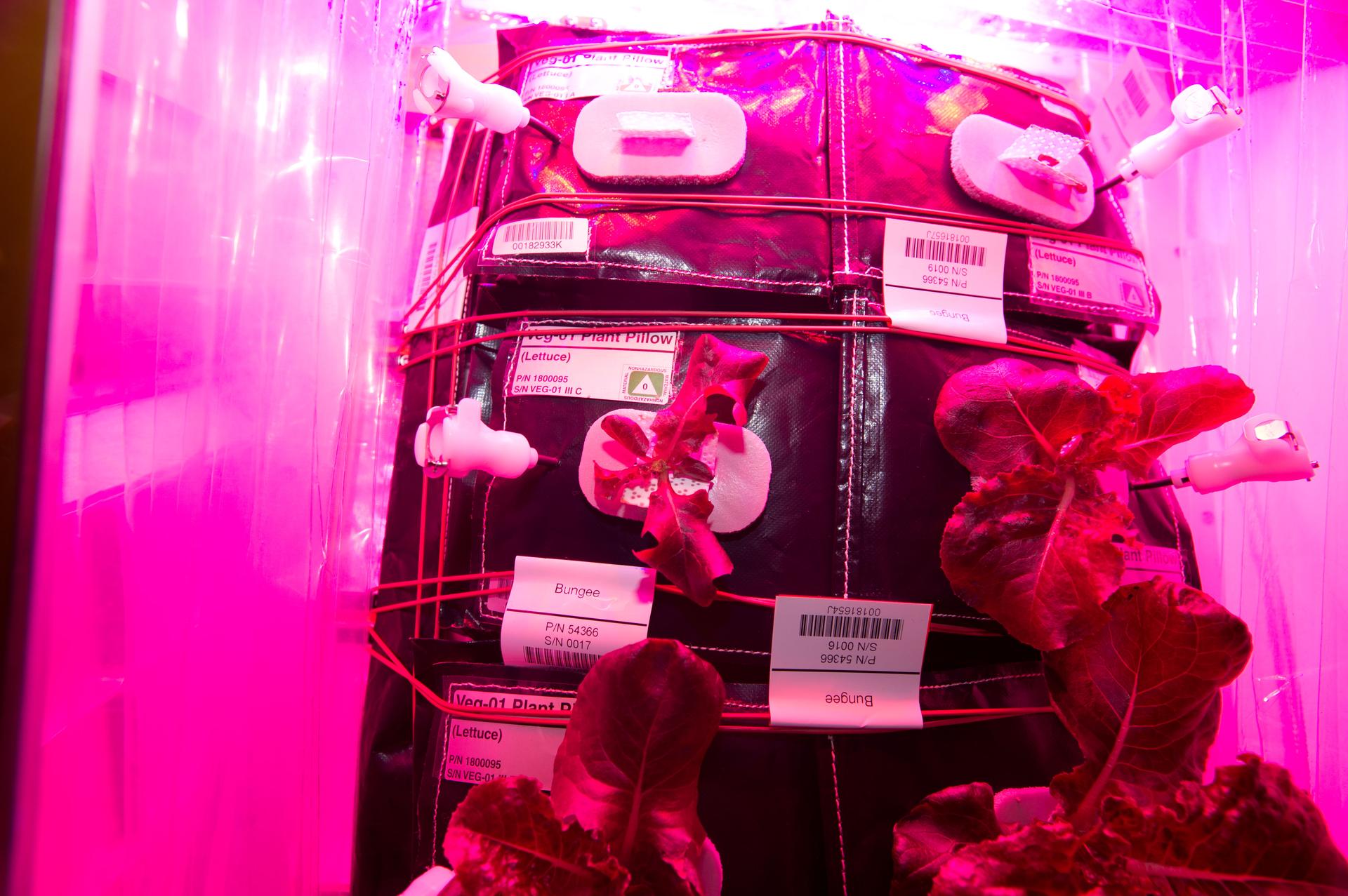 Astronaut Scott Kelly initiated VEG-01 B, the second crop of lettuce, on July, 8, 2015, and both Kelly and Astronaut Kjell Lindgren cared for the plants. The crop grew for 33 days. VEG-01 B included one set of six plant pillows planted with red romaine lettuce seeds. On Aug. 10, 2015, the crew harvested and consumed leaves from each plant. This was the first crop grown and consumed in NASA hardware. They harvested the rest of the plant tissue and froze it in the station’s Minus Eighty-Degree Laboratory Freezer for ISS (MELFI) for return to Earth for further study including microbial analysis, antioxidant capacity, mineral analysis and anthocyanin concentration.