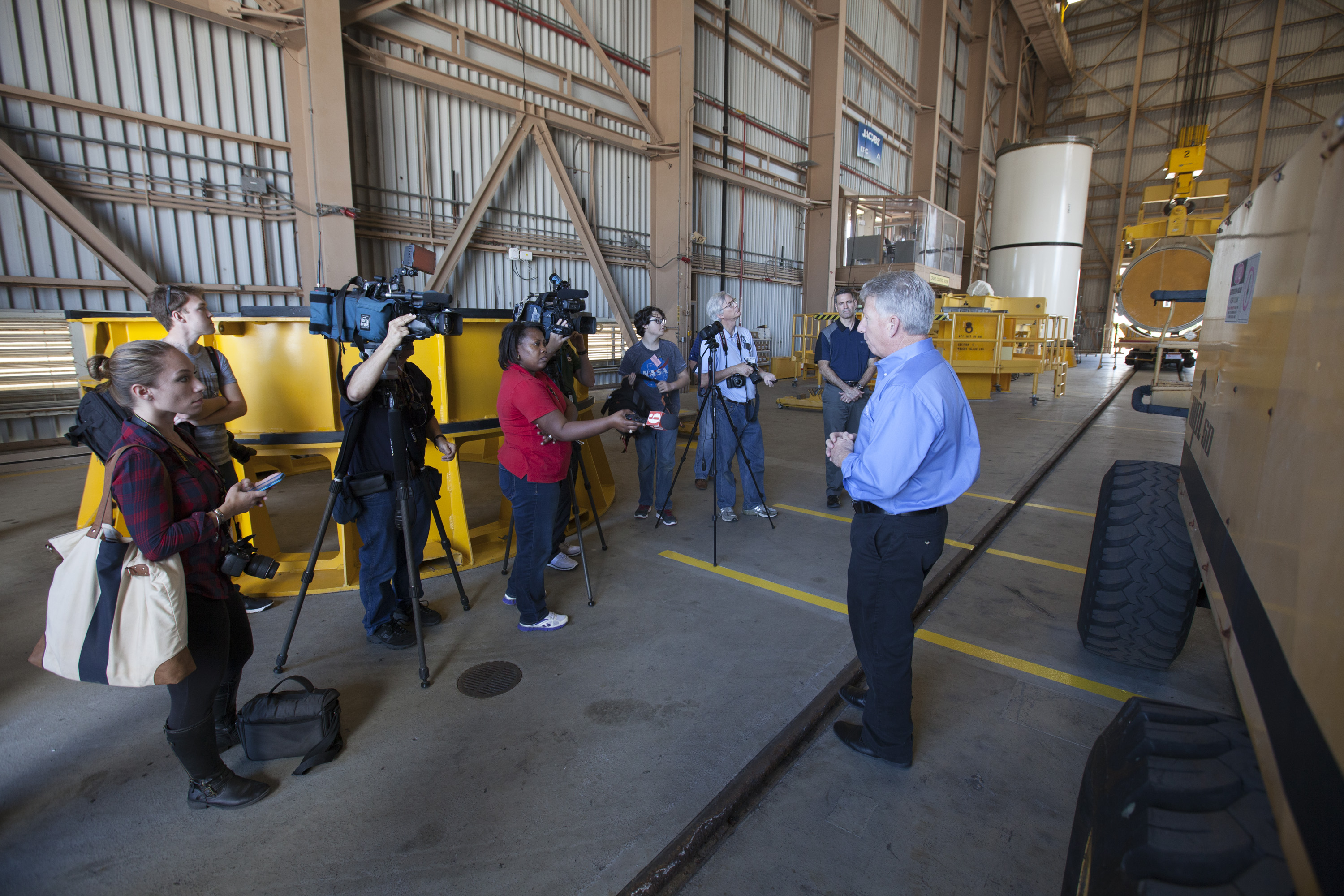 Members of the news media view the high bay inside the Rotation, Processing and Surge Facility (RPSF) at NASA’s Kennedy Space Center in Florida. Kerry Chreist, with Jacobs Engineering on the Test and Operations Support Contract, explains the various test stands and how they will be used to prepare booster segments for NASA’s Space Launch System (SLS) rocket. In the far corner, in the vertical position, is one of two pathfinders, or test versions, of solid rocket booster segments for the SLS rocket. The Ground Systems Development and Operations Program and Jacobs are preparing the booster segments, which are inert, for a series of lifts, moves and stacking operations to prepare for Exploration Mission-1, deep-space missions and the journey to Mars.
