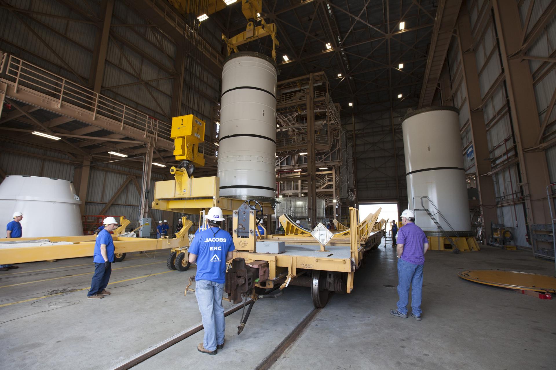 Engineers and technicians with Jacobs Engineering on the Test and Operations Contract monitor the progress as a crane is used to move one of two pathfinders, or test versions, of solid rocket booster segments for NASA’s Space Launch System (SLS) rocket. At far right, the first pathfinder booster segment has been secured in the vertical position on a test stand. Inside the RPSF, the Ground Systems Development and Operations Program and Jacobs will prepare the booster segments, which are inert, for a series of lifts, moves and stacking operations to prepare for Exploration Mission-1, deep-space missions and the journey to Mars.