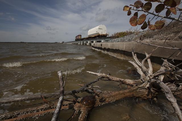 An Iowa Northern locomotive, contracted by Goodloe Transportation of Chicago, travels along the NASA railroad bridge over the Indian River north of Kennedy Space Center, carrying one of two containers on a railcar for transport to the NASA Jay Jay railroad yard near the center. The containers held two pathfinders, or test versions, of solid rocket booster segments for NASA’s Space Launch System rocket that were delivered to the Rotation, Processing and Surge Facility (RPSF). Inside the RPSF, the Ground Systems Development and Operations Program and Jacobs Engineering, on the Test and Operations Support Contract, will conduct a series of lifts, moves and stacking operations using the booster segments, which are inert, to prepare for Exploration Mission-1, deep-space missions and the journey to Mars. The pathfinder booster segments are from Orbital ATK in Utah.