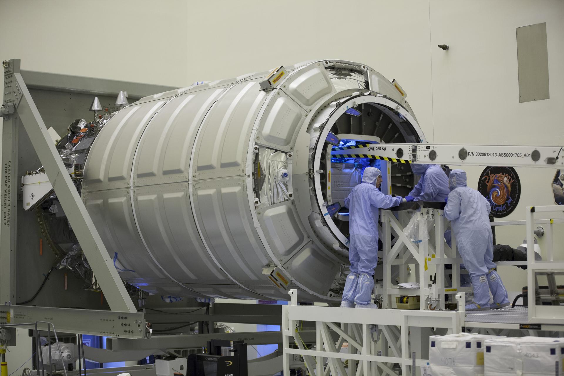 Technicians move cargo into the Orbital ATK CRS-6 pressurized cargo module during late stowage inside the Payload Hazardous Servicing Facility at NASA’s Kennedy Space Center in Florida. The spacecraft is scheduled for the upcoming Orbital ATK Commercial Resupply Services-6 mission to deliver hardware and supplies to the International Space Station. The Cygnus is scheduled to lift off atop a United Launch Alliance Atlas V rocket on March 22.