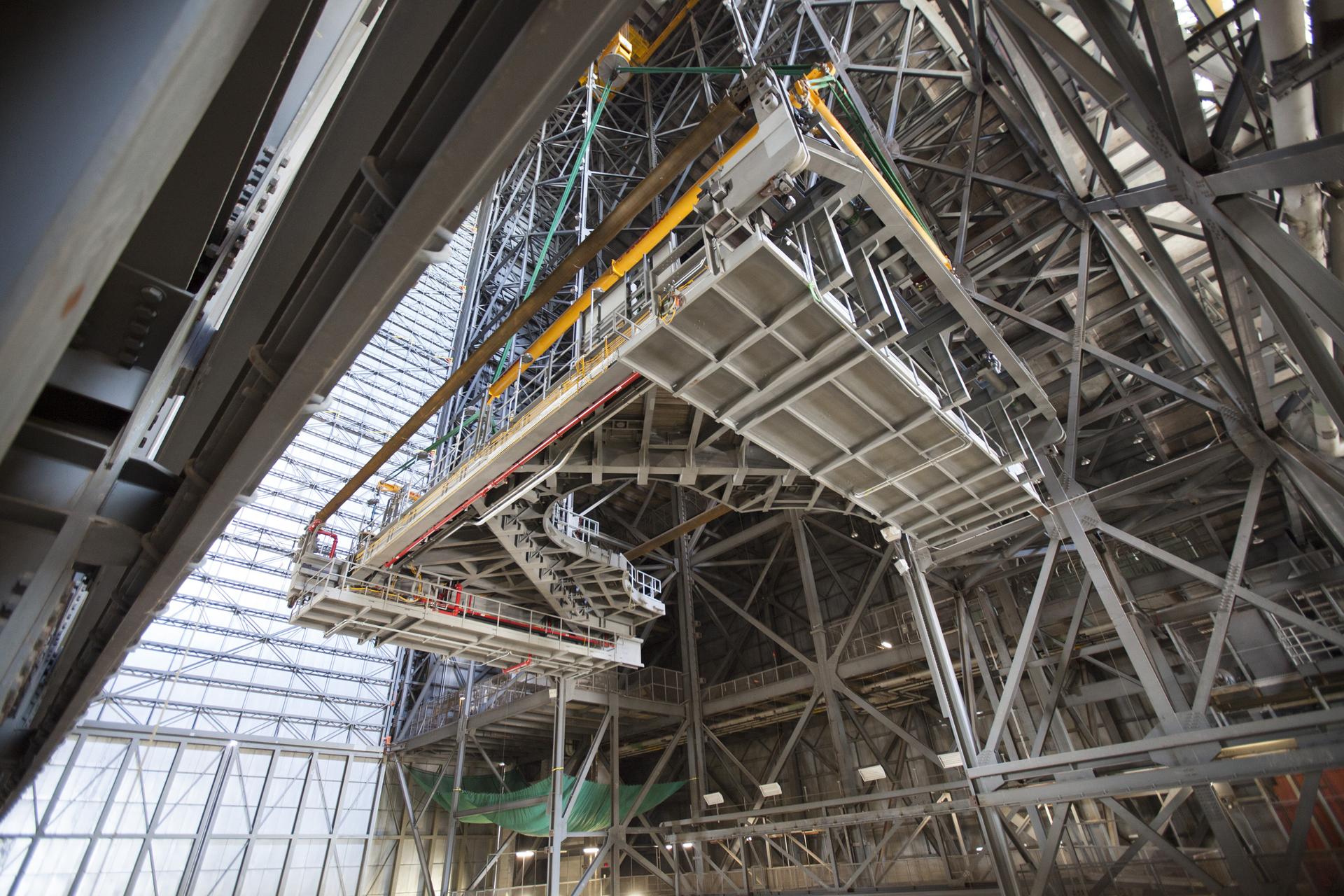 A 250-ton crane is used to lift the second half of the K-level work platforms for NASA’s Space Launch System (SLS) rocket up from High Bay 4 inside the Vehicle Assembly Building at NASA's Kennedy Space Center in Florida. The platform will be lifted up and over the transfer aisle and then lowered into High Bay 3 for installation. It will be secured about 86 feet above the VAB floor, on tower E of the high bay. The K work platforms will provide access to the SLS core stage and solid rocket boosters during processing and stacking operations on the mobile launcher. The Ground Systems Development and Operations Program is overseeing upgrades and modifications to High Bay 3 to support processing of the SLS and Orion spacecraft. A total of 10 levels of new platforms, 20 platform halves altogether, will surround the SLS rocket and Orion spacecraft.