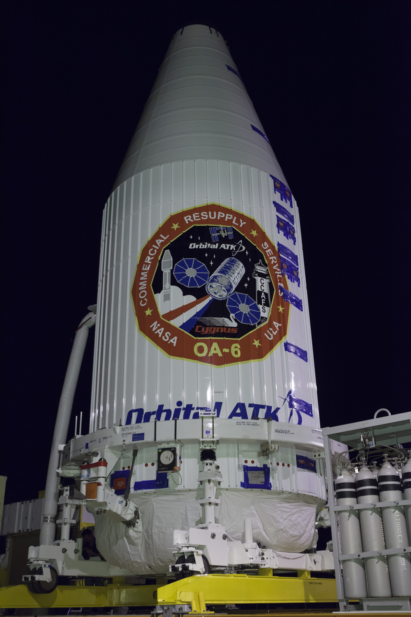 Encapsulated inside its payload fairing, the Cygnus spacecraft for the upcoming Orbital ATK Commercial Resupply Services-6 mission departs the Payload Hazardous Servicing Facility at NASA's Kennedy Space Center in Florida. Mounted atop a KAMAG transporter, Cygnus is being moved to Space Launch Complex-41 at Cape Canaveral Air Force Station where it will be mounted atop a United Launch Alliance Atlas V rocket. The Cygnus is scheduled to lift off atop a United Launch Alliance Atlas V rocket on March 22 to deliver hardware and supplies to the International Space Station.