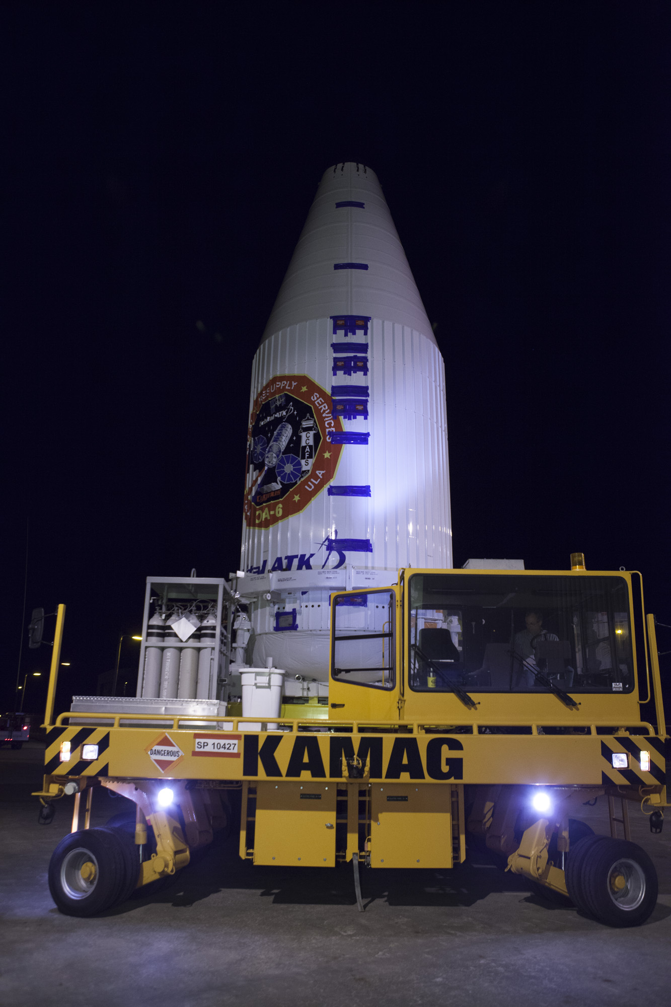 Encapsulated inside its payload fairing, the Cygnus spacecraft for the upcoming Orbital ATK Commercial Resupply Services-6 mission departs the Payload Hazardous Servicing Facility at NASA's Kennedy Space Center in Florida. Mounted atop a KAMAG transporter, Cygnus is being moved to Space Launch Complex-41 at Cape Canaveral Air Force Station where it will be mounted atop a United Launch Alliance Atlas V rocket. The Cygnus is scheduled to lift off atop a United Launch Alliance Atlas V rocket on March 22 to deliver hardware and supplies to the International Space Station.
