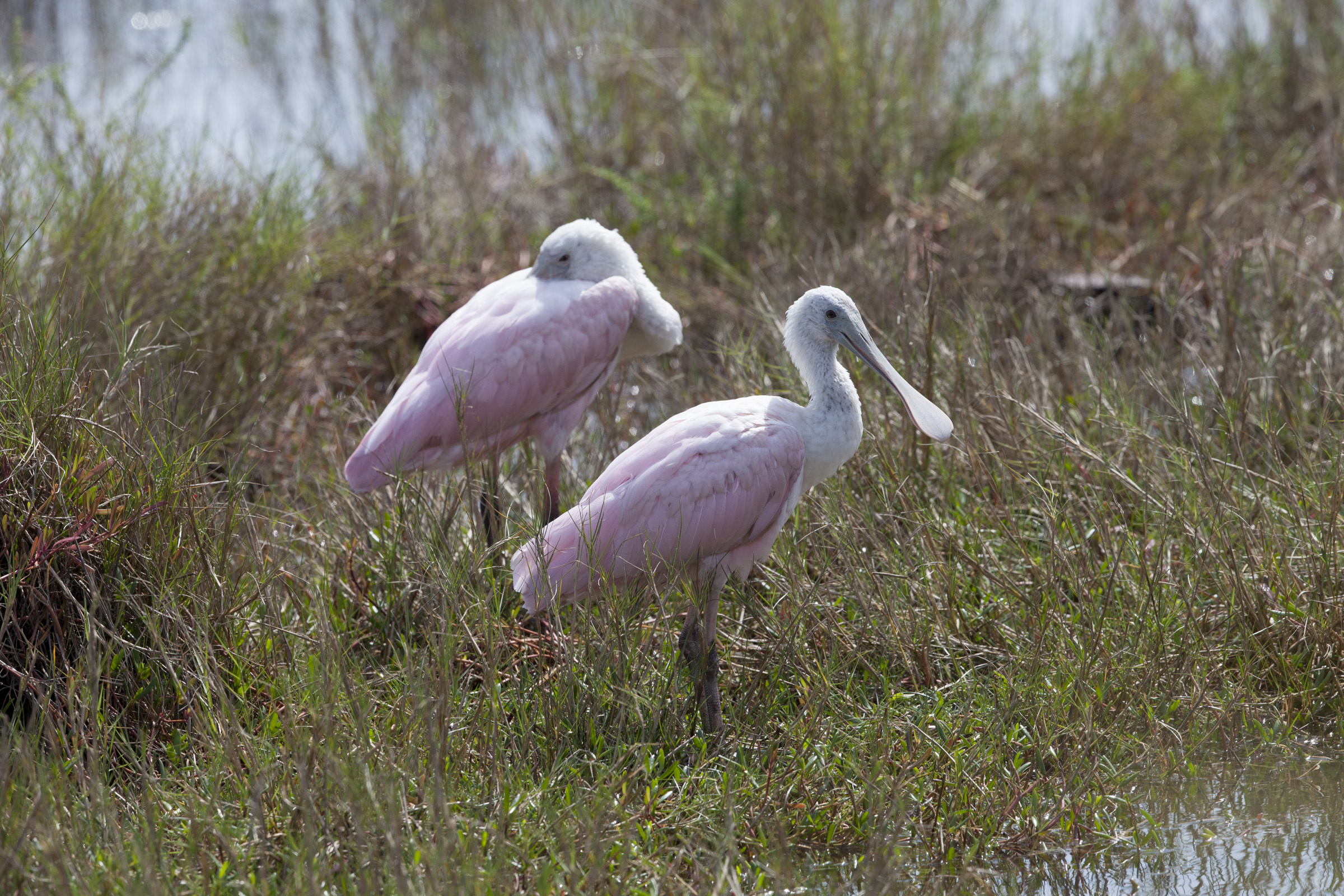 Two juvenile roseate spoonbills pause near a waterway at Merritt Island National Wildlife Refuge in Florida. NASA’s Kennedy Space Center shares boundaries with the refuge, which is home to more than 330 native and migratory bird species, along with 25 mammal, 117 fish, and 65 amphibian and reptile species.