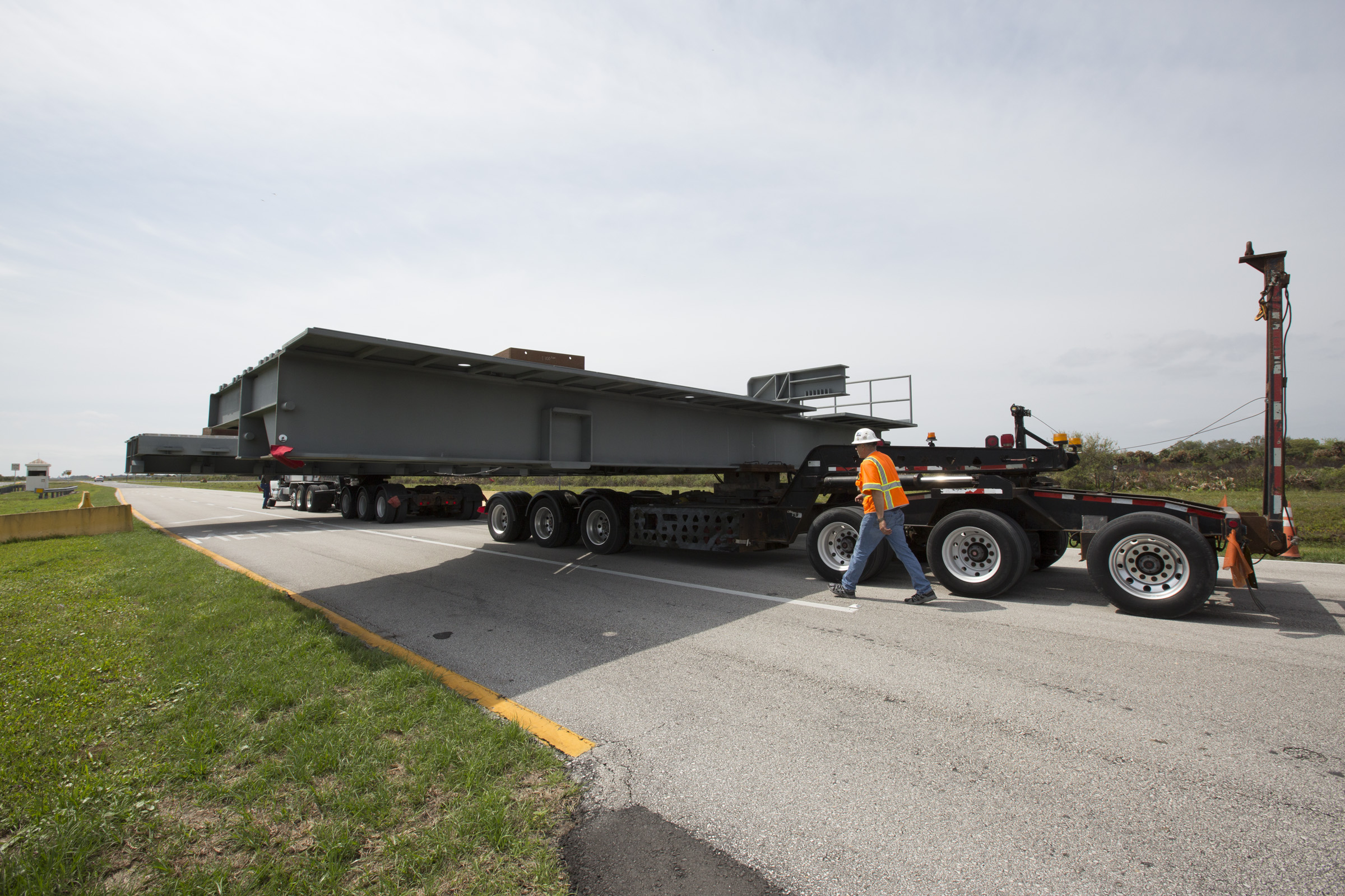 A heavy load transport truck proceeds along the road to the Vehicle Assembly Building (VAB) at NASA’s Kennedy Space Center in Florida, carrying the second half of the F-level work platforms for the agency’s Space Launch System (SLS) rocket. The platform will be delivered to the VAB staging area in the west parking lot. The Ground Systems Development and Operations Program is overseeing upgrades and modifications to VAB High Bay 3 to support processing of the SLS and Orion spacecraft. A total of 10 levels of new platforms, 20 platform halves altogether, will surround the SLS rocket and Orion spacecraft and provide access for testing and processing. Delivery of this platform brings the total to 10 platforms, or half of the work platforms delivered to Kennedy.