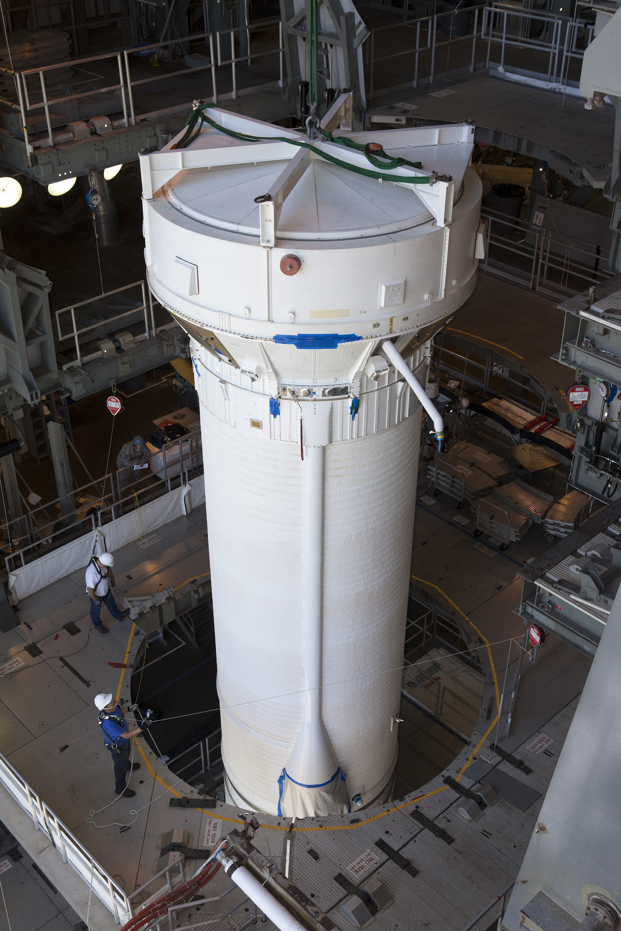Team members prepare to attach a Centaur upper stage to the United Launch Alliance Atlas V rocket first stage booster at Space Launch Complex 41 on Florida’s Cape Canaveral Air Force Station. The rocket will boost NASA’s Origins, Spectral Interpretation, Resource Identification, Security-Regolith Explorer, or OSIRIS-REx spacecraft. Targeted for liftoff Sept. 8, 2016, OSIRIS-Rex will be the first U.S. mission to sample an asteroid, retrieve at least two ounces of surface material and return it to Earth for study. The asteroid, Bennu, may hold clues to the origin of the solar system and the source of water and organic molecules found on Earth.