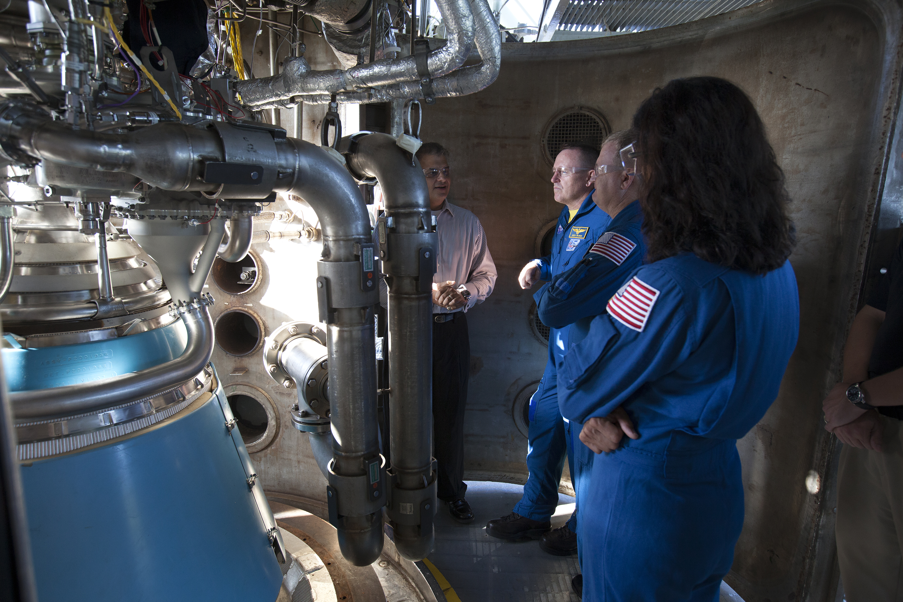 Carlos Rodriguez, from left, manager of systems development, verification and testing for Aerojet Rocketdyne, talks with NASA astronauts Barry "Butch" Wilmore, Eric Boe and Suni Williams as the group surveys an RL10 engine as it stands in a vacuum chamber at Aerojet Rocketdyne's test stand in West Palm Beach, Florida. The engine will be one of two used for the Centaur upper stage during a United Launch Alliance Atlas V mission to launch Boeing's CST-100 Starliner on a flight test carrying a crew. The engine was test-fired as part of acceptance testing to confirm the engine is ready for flight.