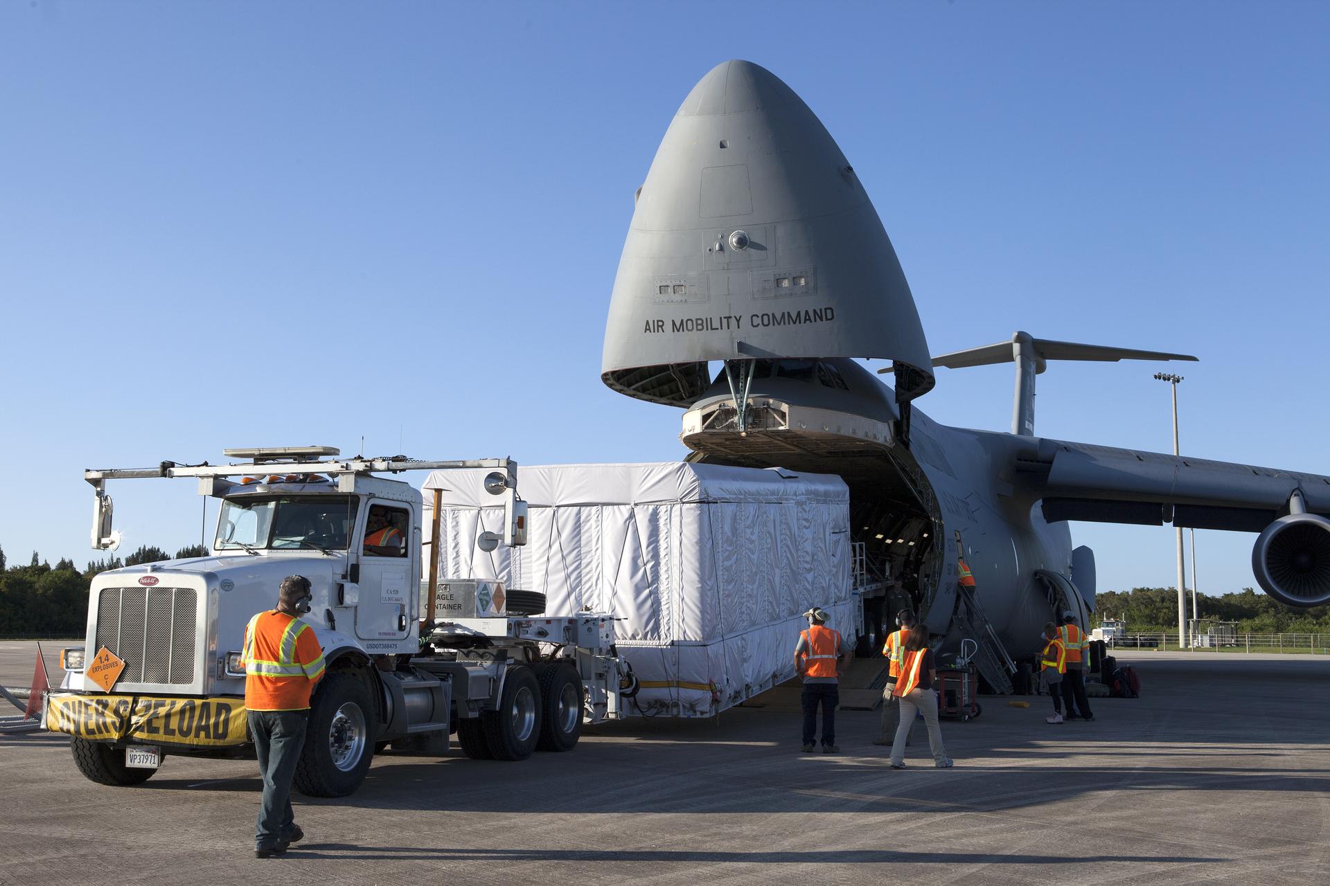 A truck with a specialized transporter drives out of the cargo hold of an Air Force C-5 Galaxy transport plane at the Shuttle Landing Facility at NASA's Kennedy Space Center in Florida to deliver the GOES-R spacecraft for launch processing. The GOES series are weather satellites operated by NOAA to enhance forecasts. The spacecraft is to launch aboard a United Launch Alliance Atlas V rocket in November.