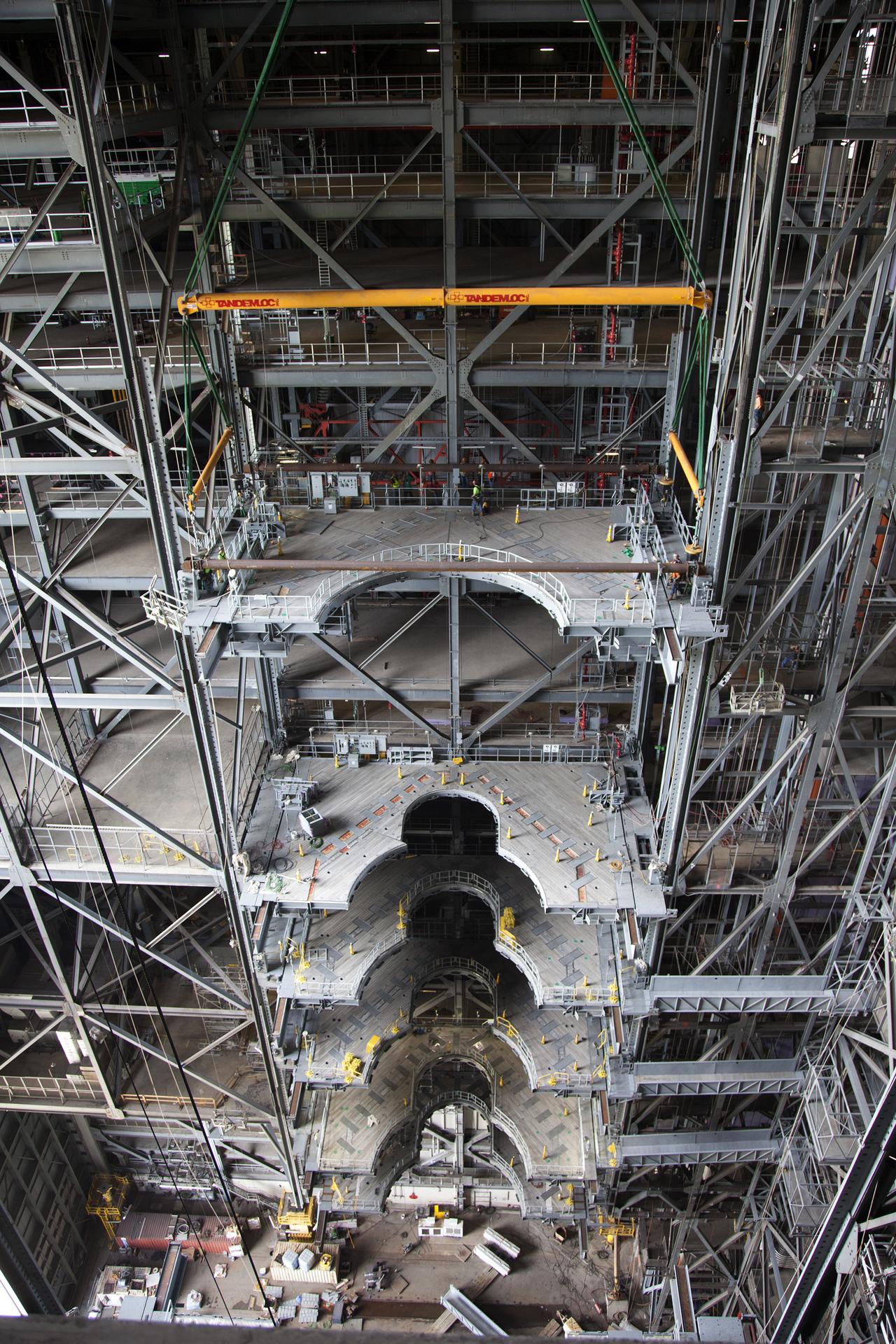 A heavy-lift crane lowers the first half of the E-level work platforms, E south, for NASA’s Space Launch System (SLS) rocket, into position for installation in High Bay 3 in the Vehicle Assembly Building (VAB) at NASA’s Kennedy Space Center in Florida. Large Tandemloc bars have been attached to the platform to keep it level during lifting and installation. In view are five levels of platforms previously installed. The E platform will be installed on the south side of High Bay 3, about 246 feet above the floor. The E platforms are the sixth of 10 levels of work platforms that will surround and provide access to the SLS rocket and Orion spacecraft for Exploration Mission 1. The Ground Systems Development and Operations Program is overseeing upgrades and modifications to VAB High Bay 3, including installation of the new work platforms, to prepare for NASA’s journey to Mars.