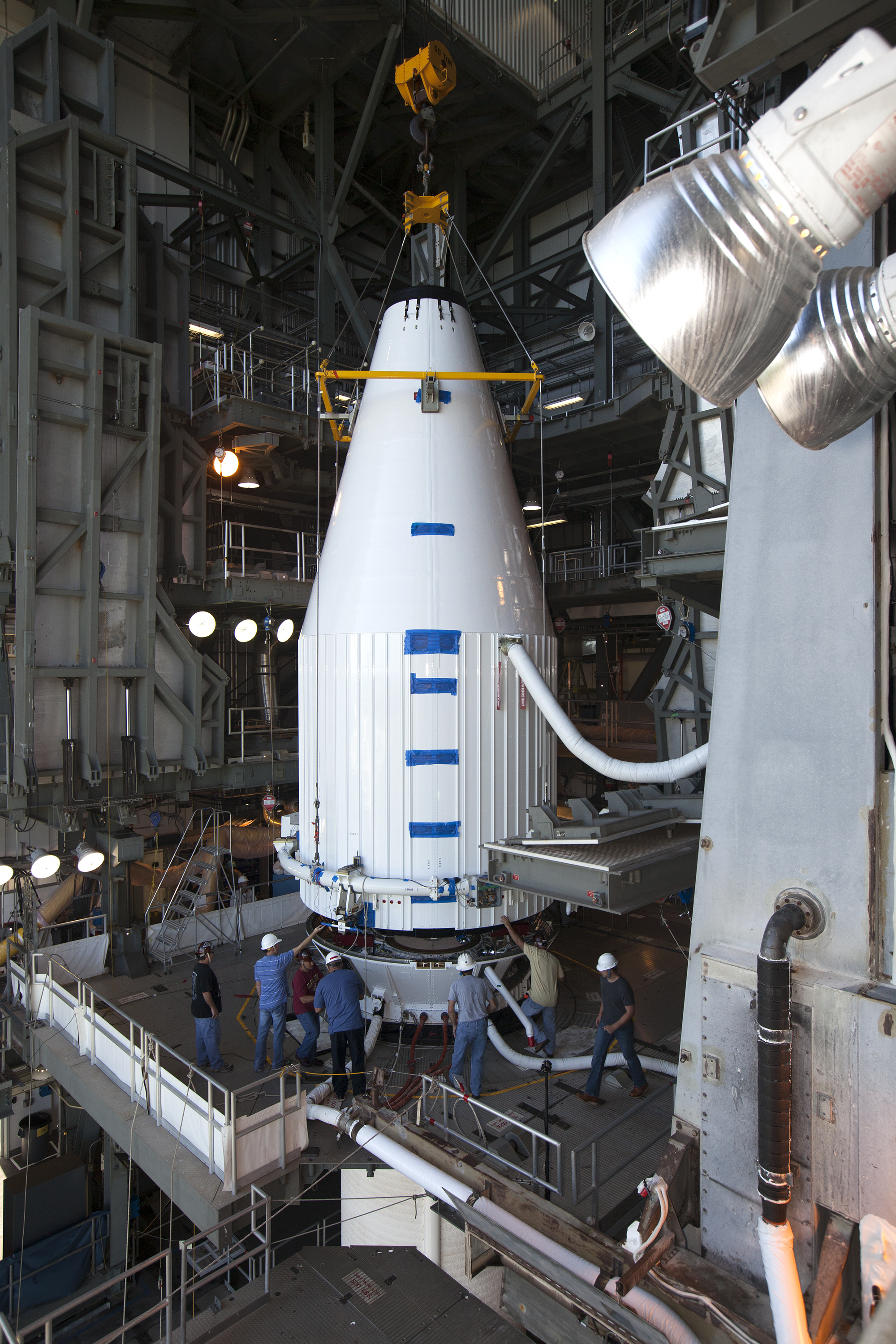 The OSIRIS-REx spacecraft, enclosed in a payload fairing, is positioned atop a United Launch Alliance Atlas V rocket at Space Launch Complex 41 at Cape Canaveral Air Force Station. The rocket that is to lift OSIRIS-REx into space was stacked at SLC-41 so the spacecraft and fairing could be hoisted and bolted to the rocket promptly. The spacecraft will be sent to rendezvous with, survey and take a sample from an asteroid called Bennu.