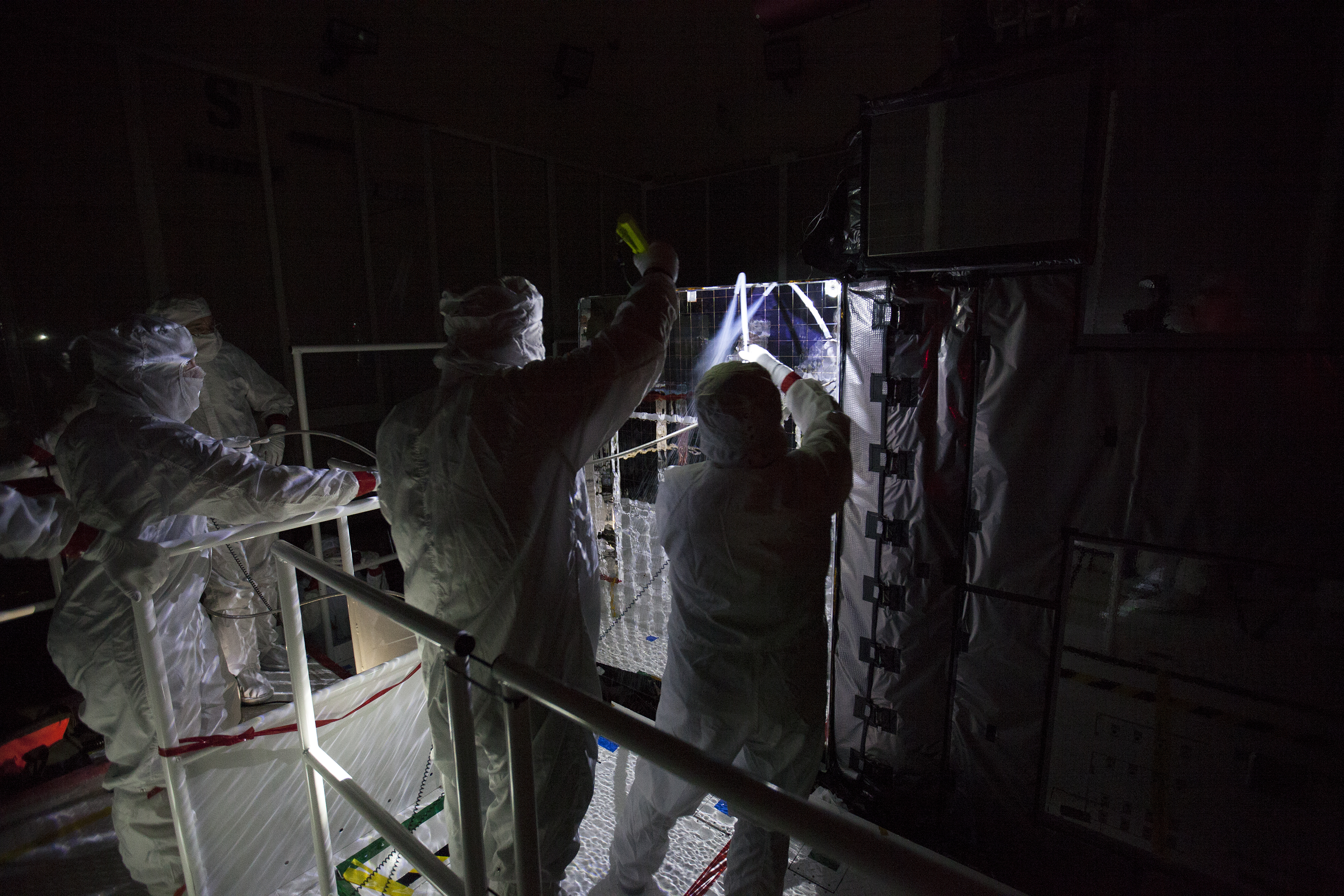 With the lights out, team members perform an optics test on the Advanced Baseline Imager, the primary optical instrument, on the Geostationary Operational Environmental Satellite (GOES-R) inside the Astrotech payload processing facility in Titusville, Florida near NASA’s Kennedy Space Center. Carbon dioxide is sprayed on the imager to clean it and test its sensitivity. GOES-R will be the first satellite in a series of next-generation NOAA GOES Satellites. The spacecraft is to launch aboard a United Launch Alliance Atlas V rocket in November.