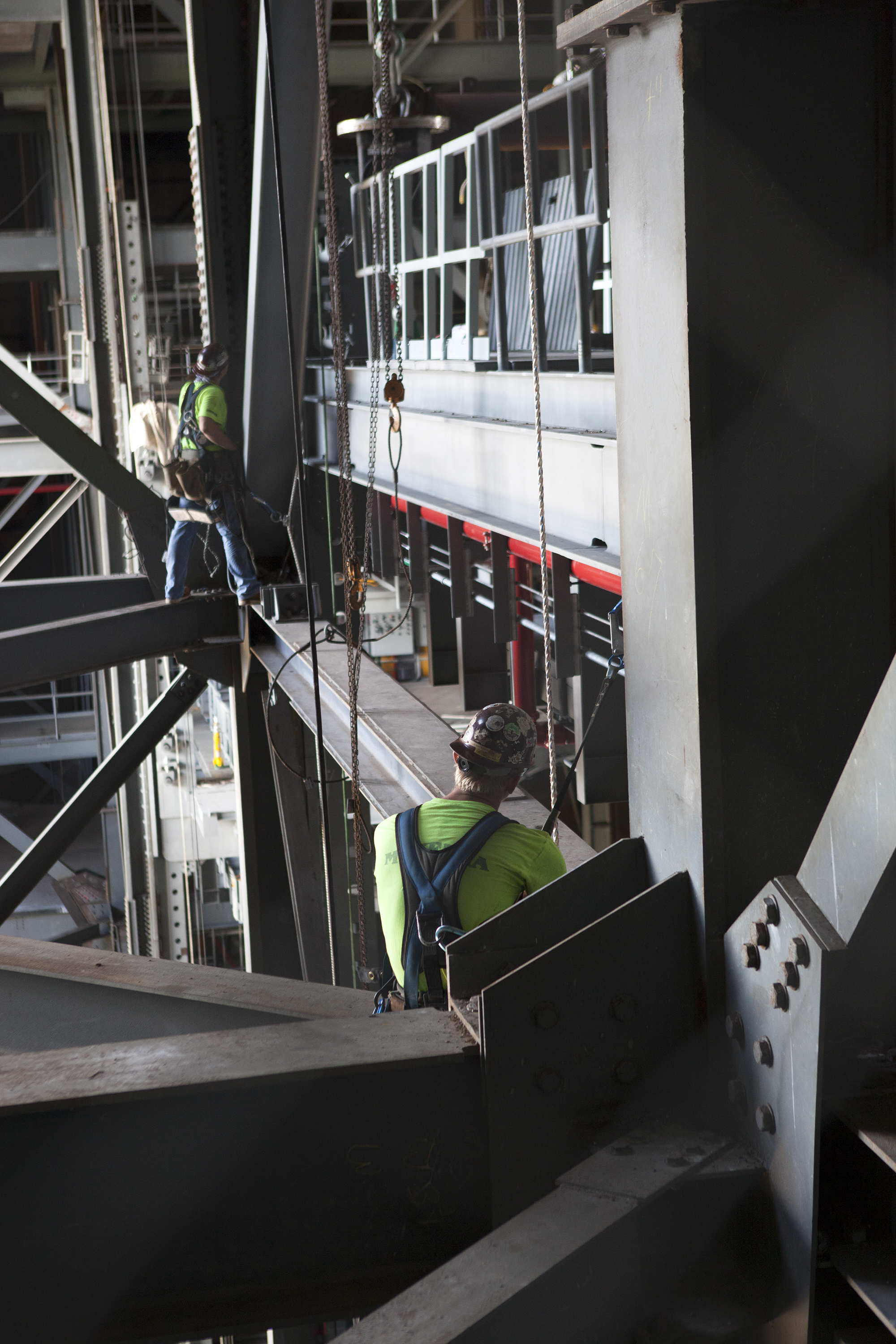 Construction workers help to secure the second half of the D-level work platforms, D north, for NASA’s Space Launch System (SLS) rocket, into position in High Bay 3 in the Vehicle Assembly Building (VAB) at the agency’s Kennedy Space Center in Florida. The D platform is being installed on the north side of the high bay. The D platforms are the seventh of 10 levels of work platforms that will surround and provide access to the SLS rocket and Orion spacecraft for Exploration Mission 1. The Ground Systems Development and Operations Program is overseeing upgrades and modifications to VAB High Bay 3, including installation of the new work platforms, to prepare for NASA’s journey to Mars.