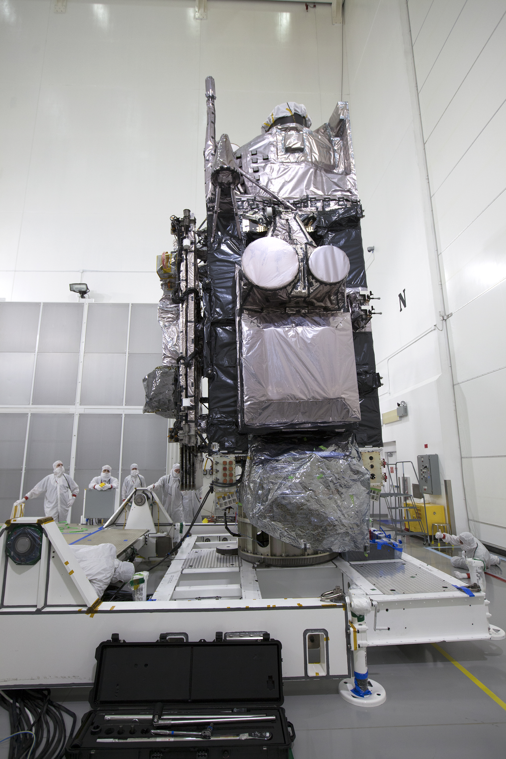 The Geostationary Operational Environmental Satellite (GOES-R) is lifted to the vertical position on an “up-ender” inside the Astrotech payload processing facility in Titusville, Florida near NASA’s Kennedy Space Center. GOES-R will be the first satellite in a series of next-generation NOAA GOES Satellites. The spacecraft is to launch aboard a United Launch Alliance Atlas V rocket in November.