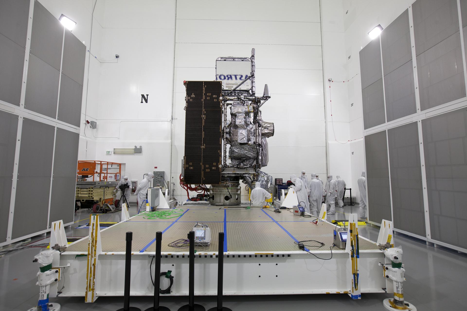 The Geostationary Operational Environmental Satellite (GOES-R) has been secured in the vertical position on an “up-ender” inside the Astrotech payload processing facility in Titusville, Florida near NASA’s Kennedy Space Center. GOES-R will be the first satellite in a series of next-generation NOAA GOES Satellites. The spacecraft is to launch aboard a United Launch Alliance Atlas V rocket in November.