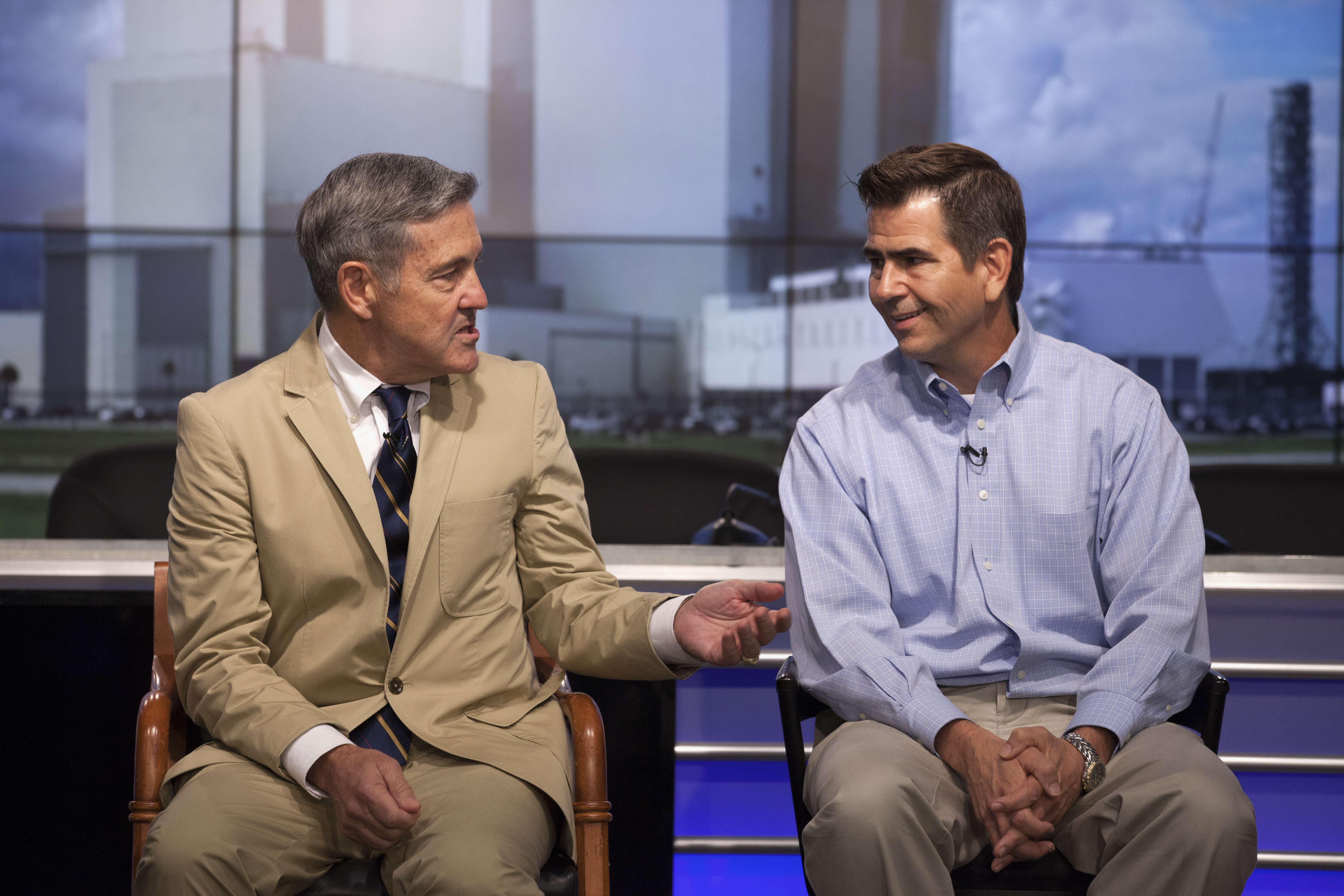 In the Press Site auditorium of NASA's Kennedy Space Center in Florida, Center Director Bob Cabana, left, and Bob Holl, chief of the Kennedy Damage Assessment and Recovery Team, speak to media about efforts to recover from Hurricane Matthew.. Officials determined that the center received some isolated roof damage, damaged support buildings, a few downed power lines, and limited water intrusion. Beach erosion also occurred, although the storm surge was less than expected. NASA closed the center ahead of the storm’s onset and only a small team of specialists known as the Ride-out Team was on the center as the storm approached and passed.