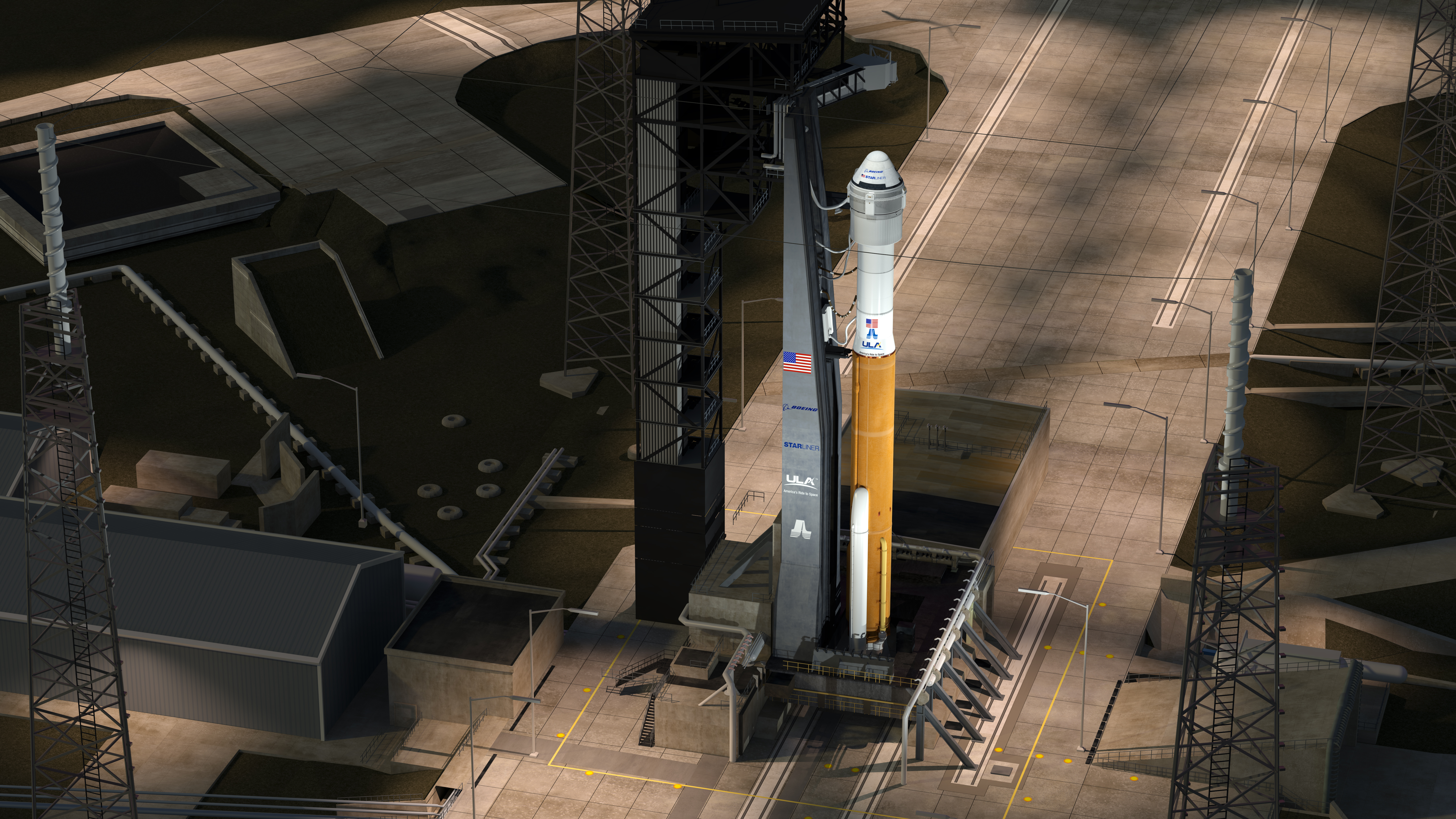 This artist concept shows a United Launch Alliance Atlas V rocket with a Boeing CST-100 Starliner capsule at Space Launch Complex-41 at Cape Canaveral Air Force Station in Florida. The Starliner/Atlas V system is under development by Boeing and ULA in partnership with NASA's Commercial Crew Program to launch astronauts to the International Space Station.