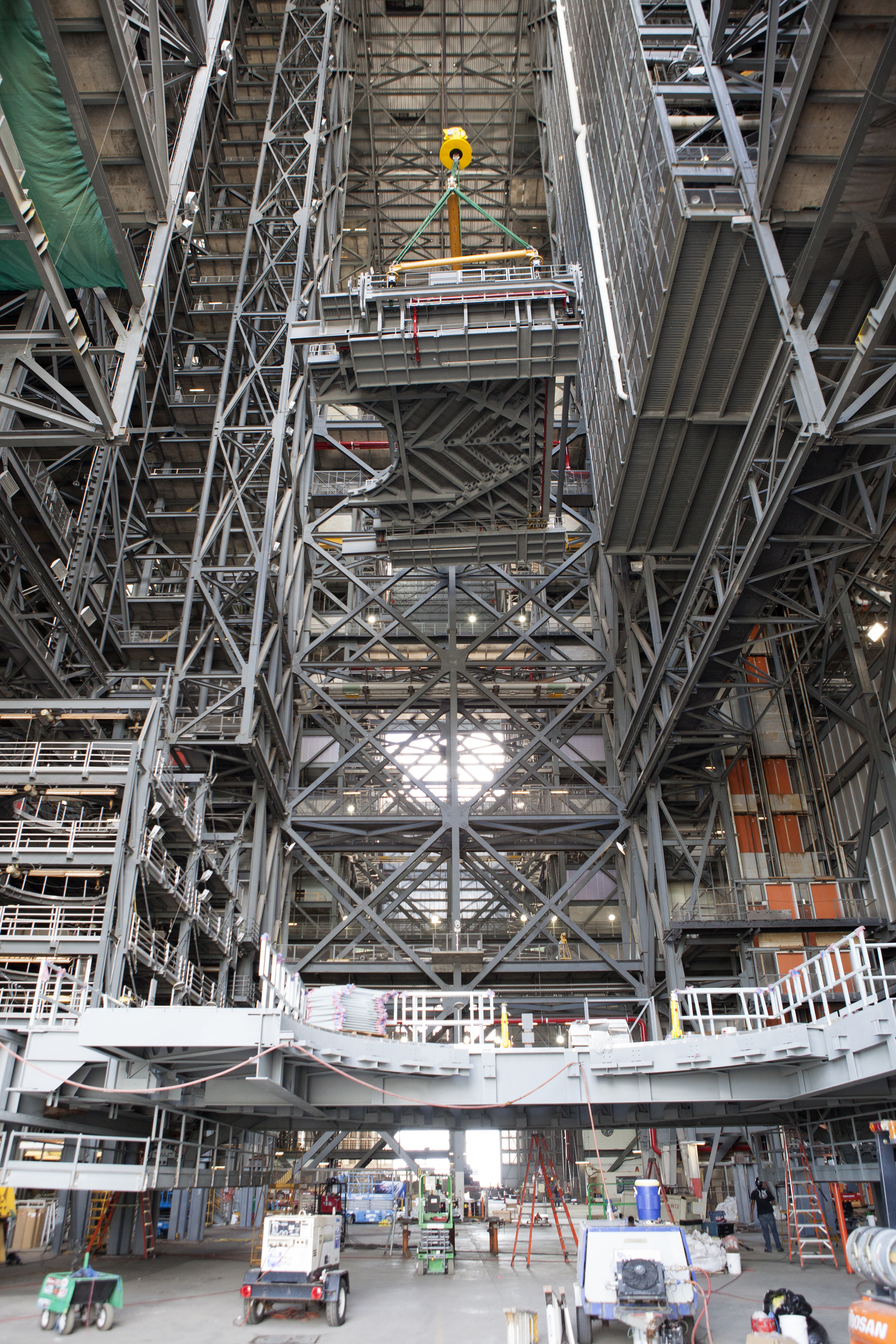 A heavy-lift crane lifts the first half of the C-level work platforms, C south, for NASA’s Space Launch System (SLS) rocket, high up from the transfer aisle floor of the Vehicle Assembly Building (VAB) at NASA’s Kennedy Space Center in Florida. The C platform will be installed on the south side of High Bay 3. The C platforms are the eighth of 10 levels of work platforms that will surround and provide access to the SLS rocket and Orion spacecraft for Exploration Mission 1. The Ground Systems Development and Operations Program is overseeing upgrades and modifications to VAB High Bay 3, including installation of the new work platforms, to prepare for NASA’s Journey to Mars.