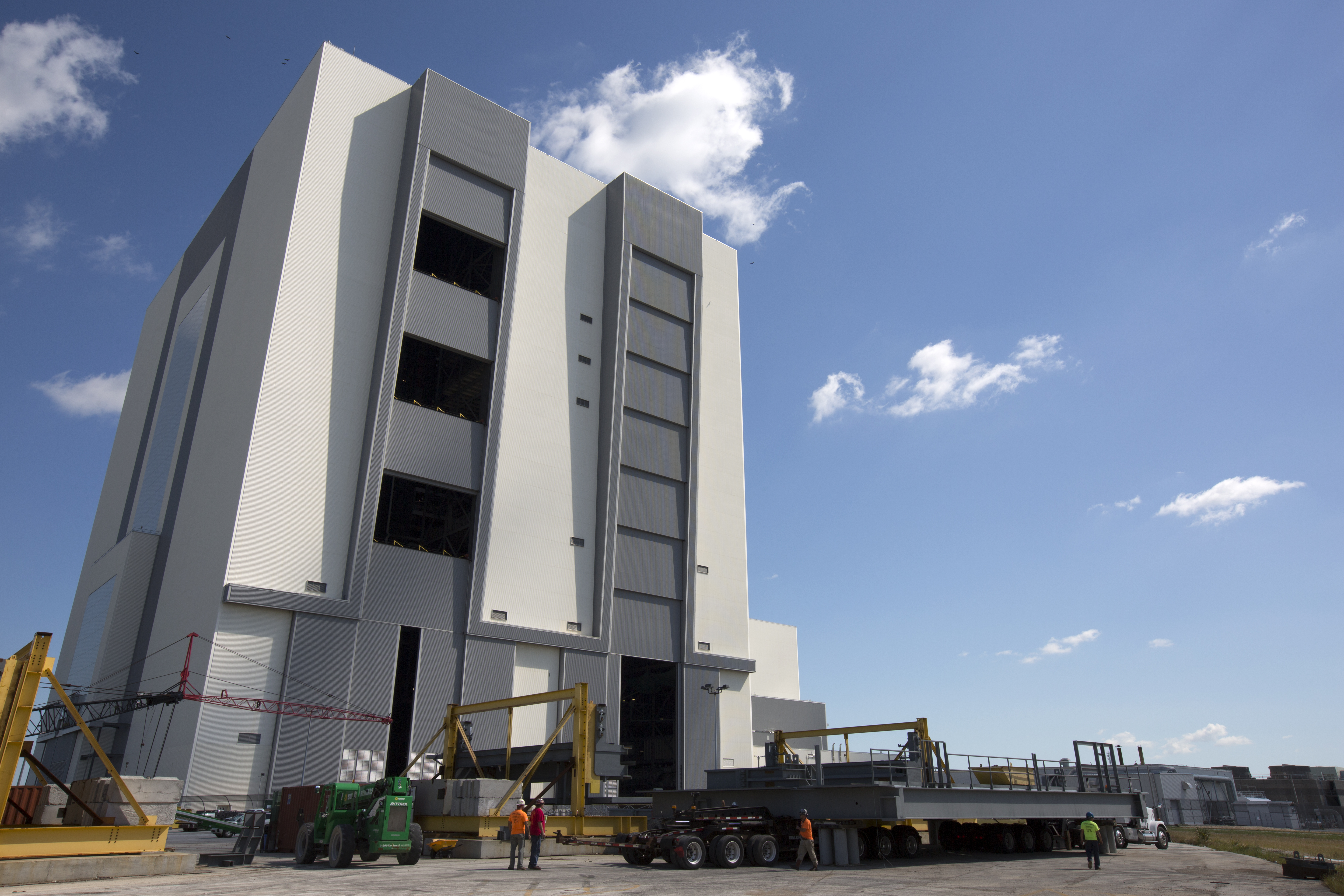 A heavy load transport truck from Tillett Heavy Hauling in Titusville, Florida, arrives at the Vehicle Assembly Building (VAB) at NASA’s Kennedy Space Center in Florida, carrying the first half of the B-level work platforms, B South, for the agency’s Space Launch System (SLS) rocket. The platform will be offloaded in the VAB staging area in the west parking lot. The Ground Systems Development and Operations Program is overseeing upgrades and modifications to VAB High Bay 3 to support processing of the SLS and Orion spacecraft. A total of 10 levels of new platforms, 20 platform halves altogether, will surround the SLS rocket and Orion spacecraft and provide access for testing and processing.