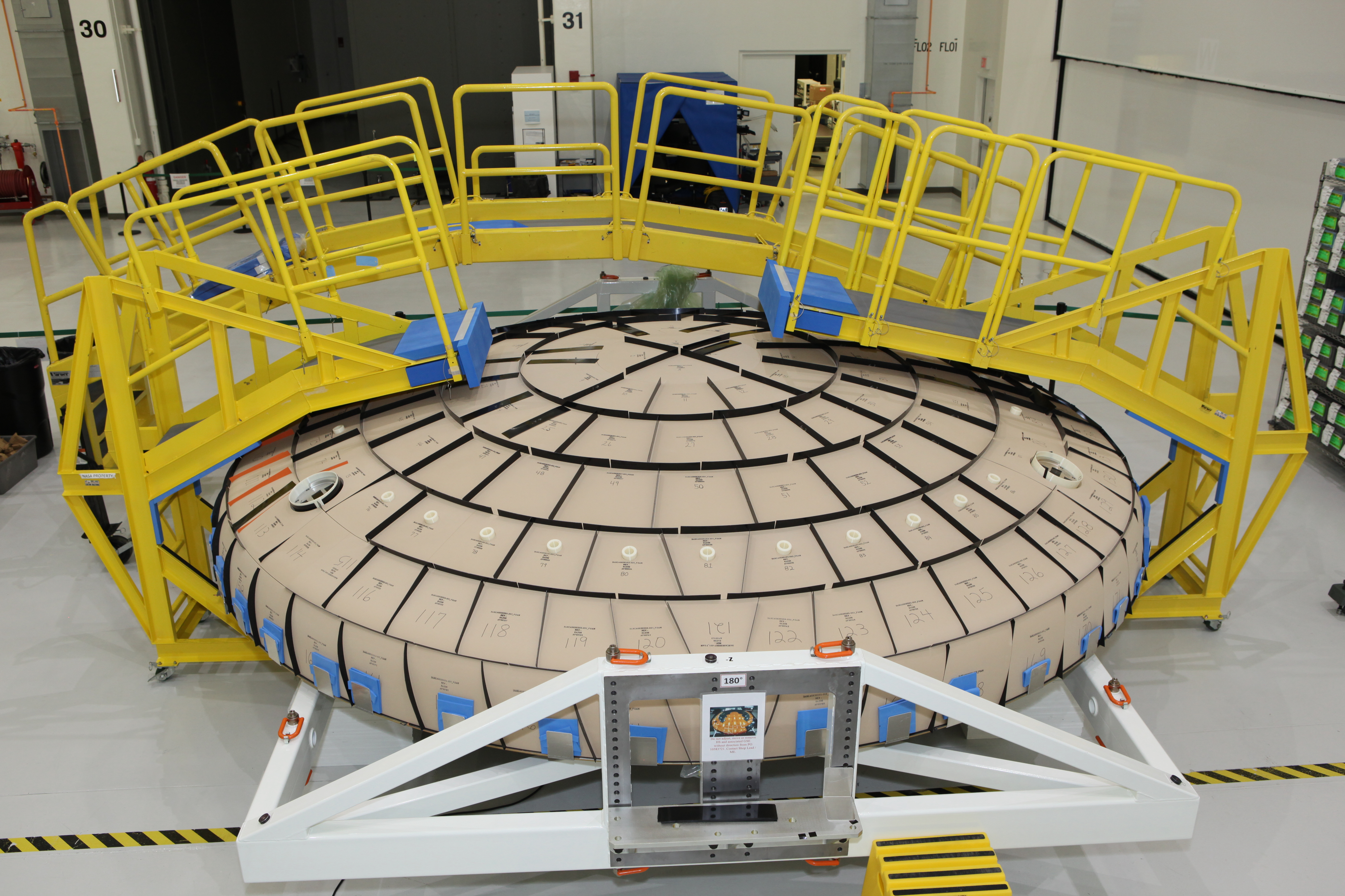 Tile blocks have been prefitted around the heat shield for the Orion crew module inside the Neil Armstrong Operations and Checkout Building high bay at NASA’s Kennedy Space Center in Florida. The heat shield is one of the most critical elements of Orion and protects it and the future astronauts inside from searing temperatures experienced during reentry through Earth’s atmosphere when they return home. For Exploration Mission-1, the top layer of Orion’s heat shield that is primarily responsible for helping the crew module endure reentry heat will be composed of approximately 180 blocks, which are made of an ablative material called Avcoat designed to wear away as it heats up. Orion is being prepared for its flight on the agency’s Space Launch System for Exploration Mission-1 in late 2018. Orion is the exploration spacecraft designed to carry astronauts to destinations not yet explored by humans, including an asteroid and NASA’s Journey to Mars. It will have emergency abort capability, sustain the crew during space travel and provide safe re-entry from deep space return velocities. For more information, visit http://www.nasa.gov/orion.
