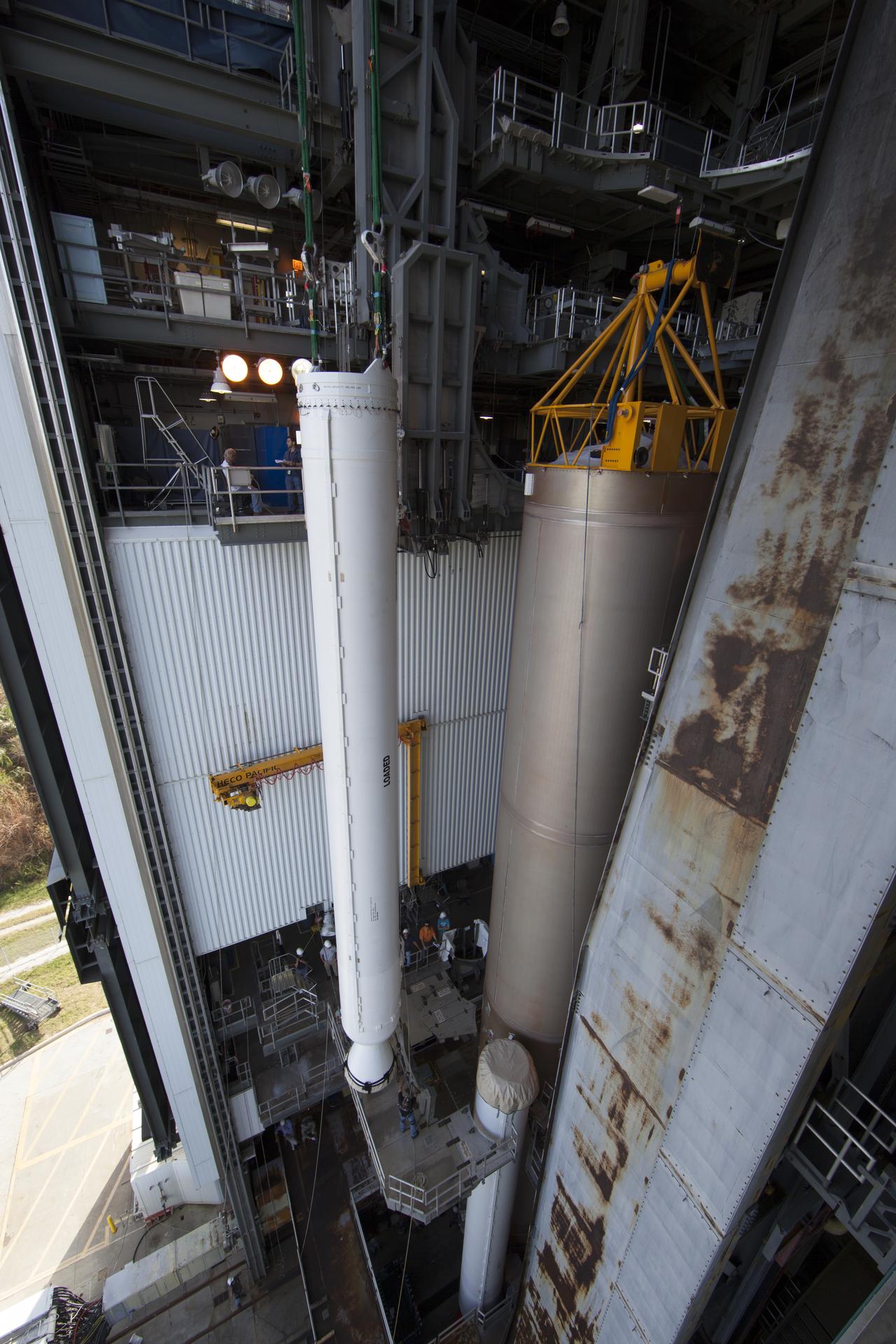 The solid rocket motor has been lifted to the vertical position and moved into the Vertical Integration Facility at Space Launch Complex 41 at Cape Canaveral Air Force Station in Florida for mating to the United Launch Alliance Atlas V rocket. NOAA's Geostationary Operational Environmental Satellite (GOES-R) will launch aboard the Atlas V rocket this month. GOES-R is the first satellite in a series of next-generation NOAA GOES Satellites.