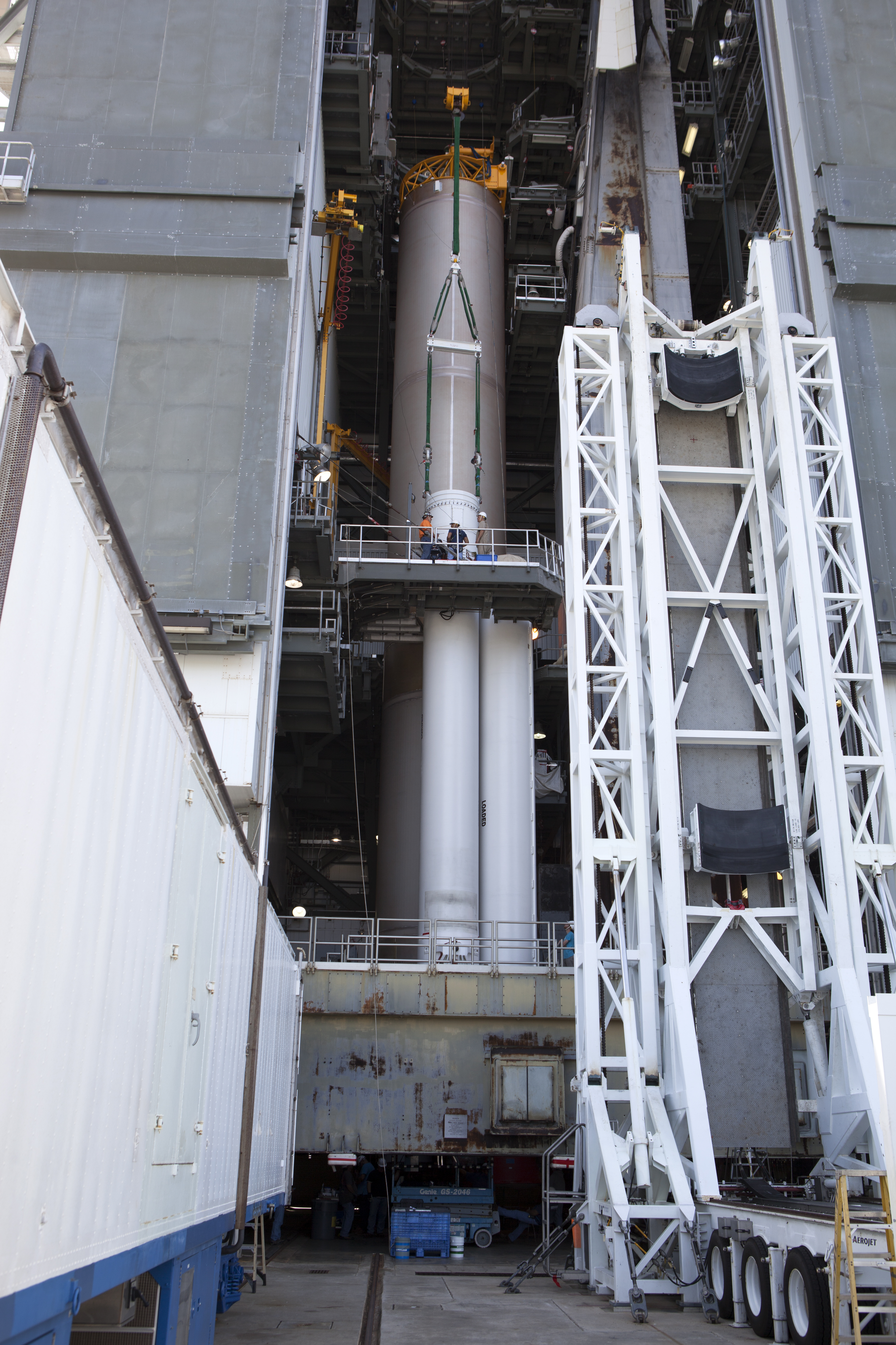 Inside the Vertical Integration Facility at Space Launch Complex 41 at Cape Canaveral Air Force Station in Florida, the solid rocket motor is mated to the United Launch Alliance Atlas V rocket for its upcoming launch. NOAA's Geostationary Operational Environmental Satellite (GOES-R) will launch aboard the Atlas V rocket this month. GOES-R is the first satellite in a series of next-generation NOAA GOES Satellites.
