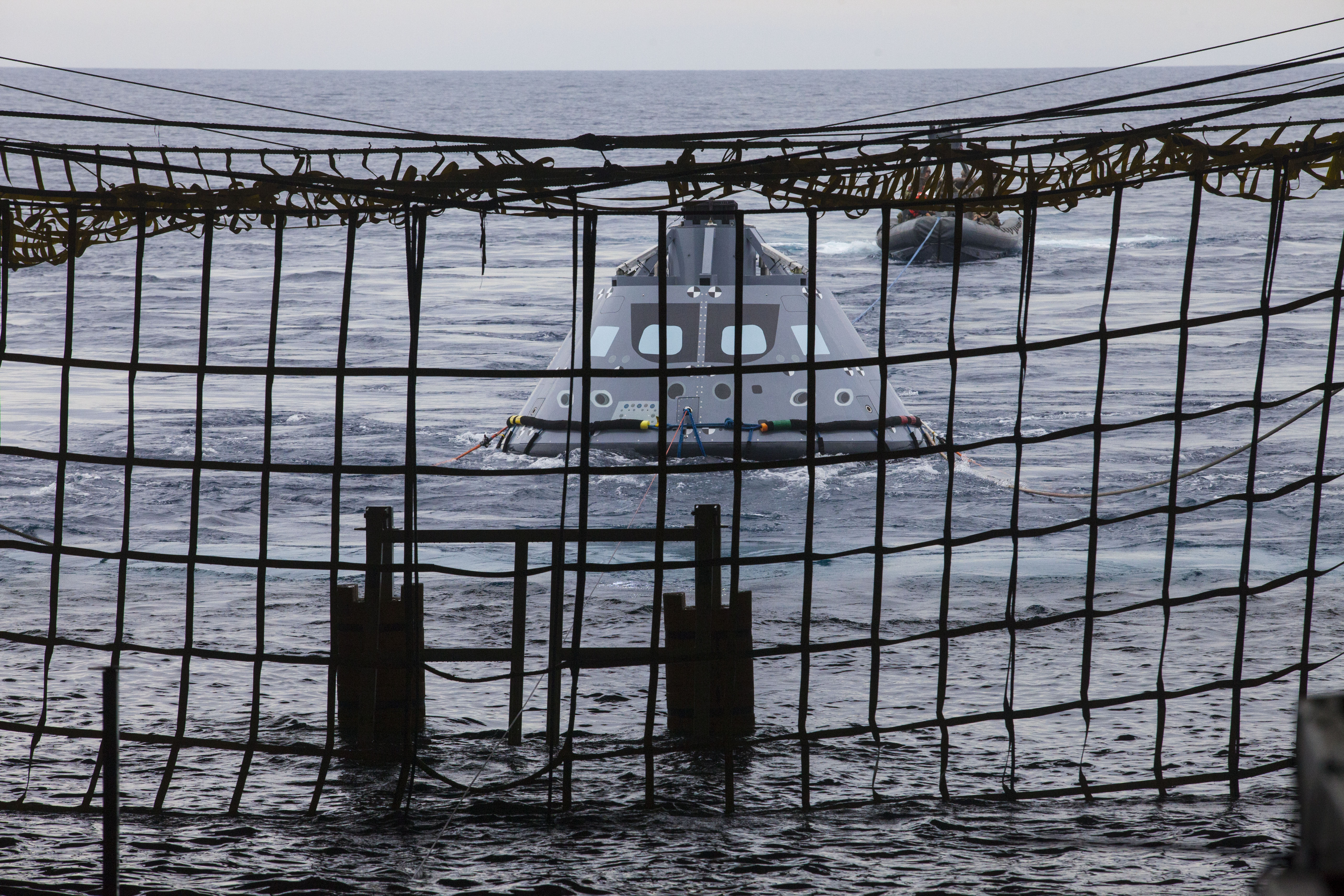 A test version of the Orion crew module is guided into the well deck of the USS San Diego during Underway Recovery Test 5 in the Pacific Ocean off the coast of California. Tether lines have been attached to the crew module by U. S. Navy divers and other personnel in a rigid hull inflatable boat. NASA's Ground Systems Development and Operations Program and the U.S. Navy are practicing recovery techniques to prepare for recovery of Orion on its return from deep space missions. The testing will allow the team to demonstrate and evaluate recovery processes, procedures, hardware and personnel in open waters. Orion is the exploration spacecraft designed to carry astronauts to destinations not yet explored by humans, including an asteroid and NASA's Journey to Mars. It will have emergency abort capability, sustain the crew during space travel and provide safe re-entry from deep space return velocities. Orion is scheduled to launch on NASA's Space Launch System in late 2018. For more information, visit http://www.nasa.gov/orion.