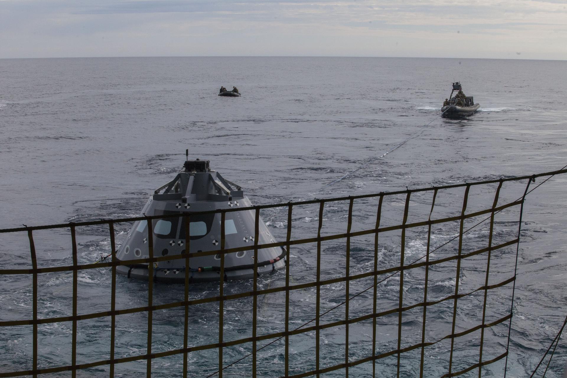 U.S. Navy divers and other personnel in a rigid hull inflatable boat are handling tether lines attached to a test version of the Orion crew module during Underway Recovery Test 5 in the Pacific Ocean off the coast of California. U.S. Navy divers in a smaller watercraft called a Zodiac boat are farther away. NASA's Ground Systems Development and Operations Program and the U.S. Navy are conducting a series of tests using the well deck of the USS San Diego, several watercraft and personnel to prepare for recovery of Orion on its return from deep space missions. The testing will allow the team to demonstrate and evaluate recovery processes, procedures, hardware and personnel in open waters. Orion is the exploration spacecraft designed to carry astronauts to destinations not yet explored by humans, including an asteroid and NASA's Journey to Mars. It will have emergency abort capability, sustain the crew during space travel and provide safe re-entry from deep space return velocities. Orion is scheduled to launch on NASA's Space Launch System in late 2018. For more information, visit http://www.nasa.gov/orion.