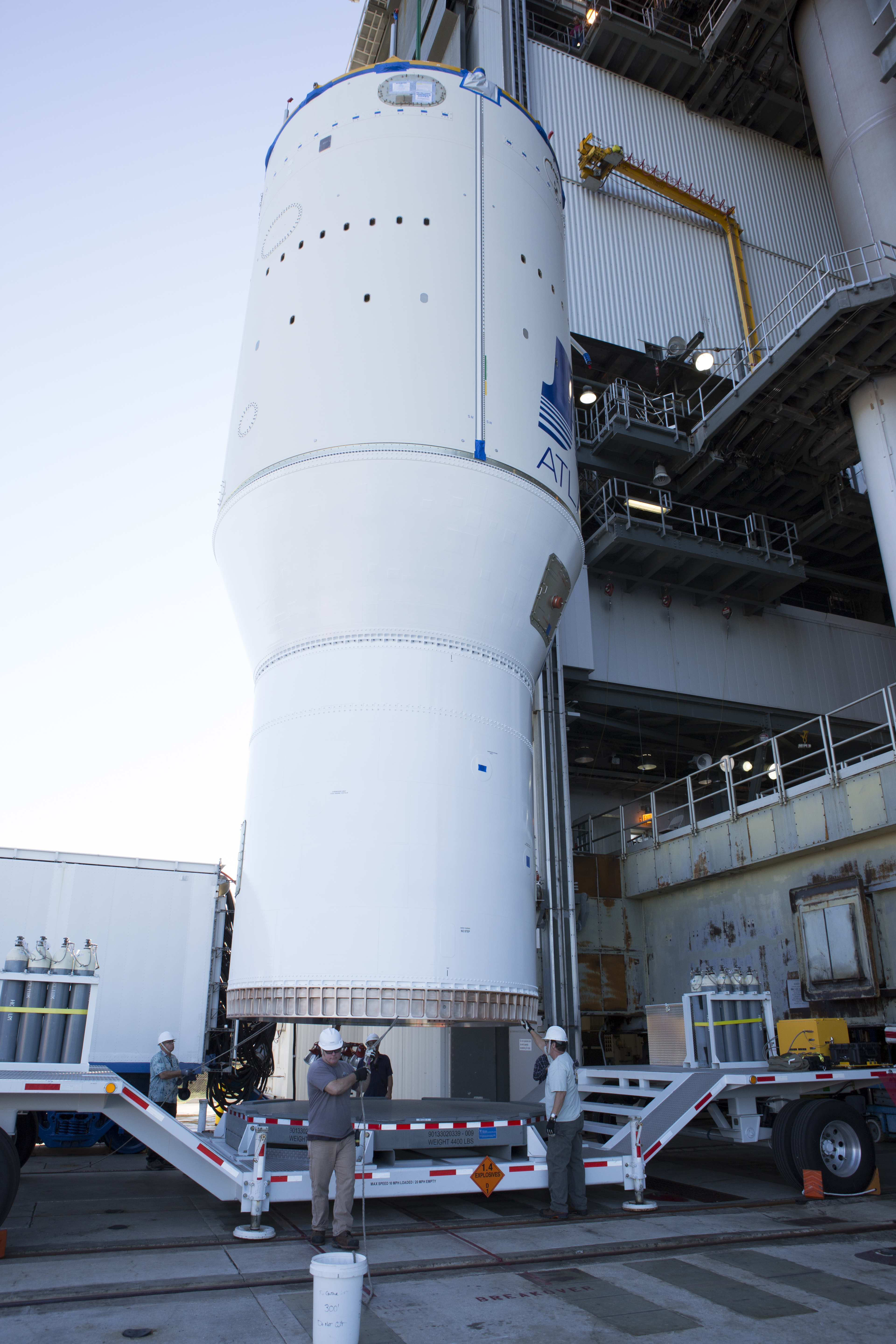 United Launch Alliance team members assist as operation begin to lift the Atlas V Centaur second stage into the Vertical Integration Facility at Space Launch Complex 41 at Cape Canaveral Air Force Station in Florida. The Geostationary Operational Environmental Satellite (GOES-R) will launch aboard the Atlas V rocket in November. GOES-R is the first satellite in a series of next-generation NOAA GOES Satellites.