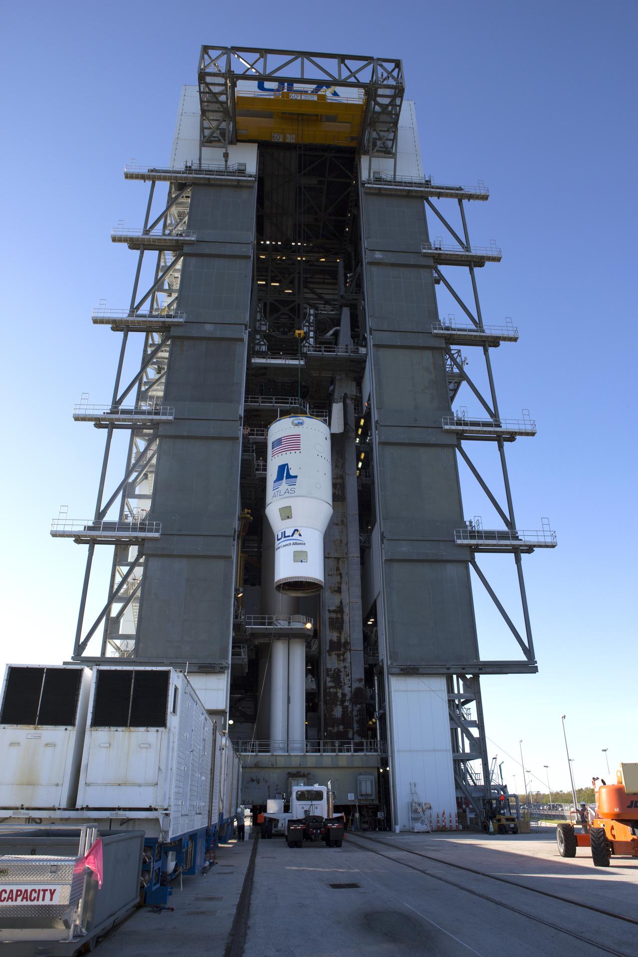 The United Launch Alliance Atlas V Centaur second stage is lifted up by crane for transfer into Vertical Integration Facility at Space Launch Complex 41 at Cape Canaveral Air Force Station in Florida. The Geostationary Operational Environmental Satellite (GOES-R) will launch aboard the Atlas V rocket in November. GOES-R is the first satellite in a series of next-generation NOAA GOES Satellites.