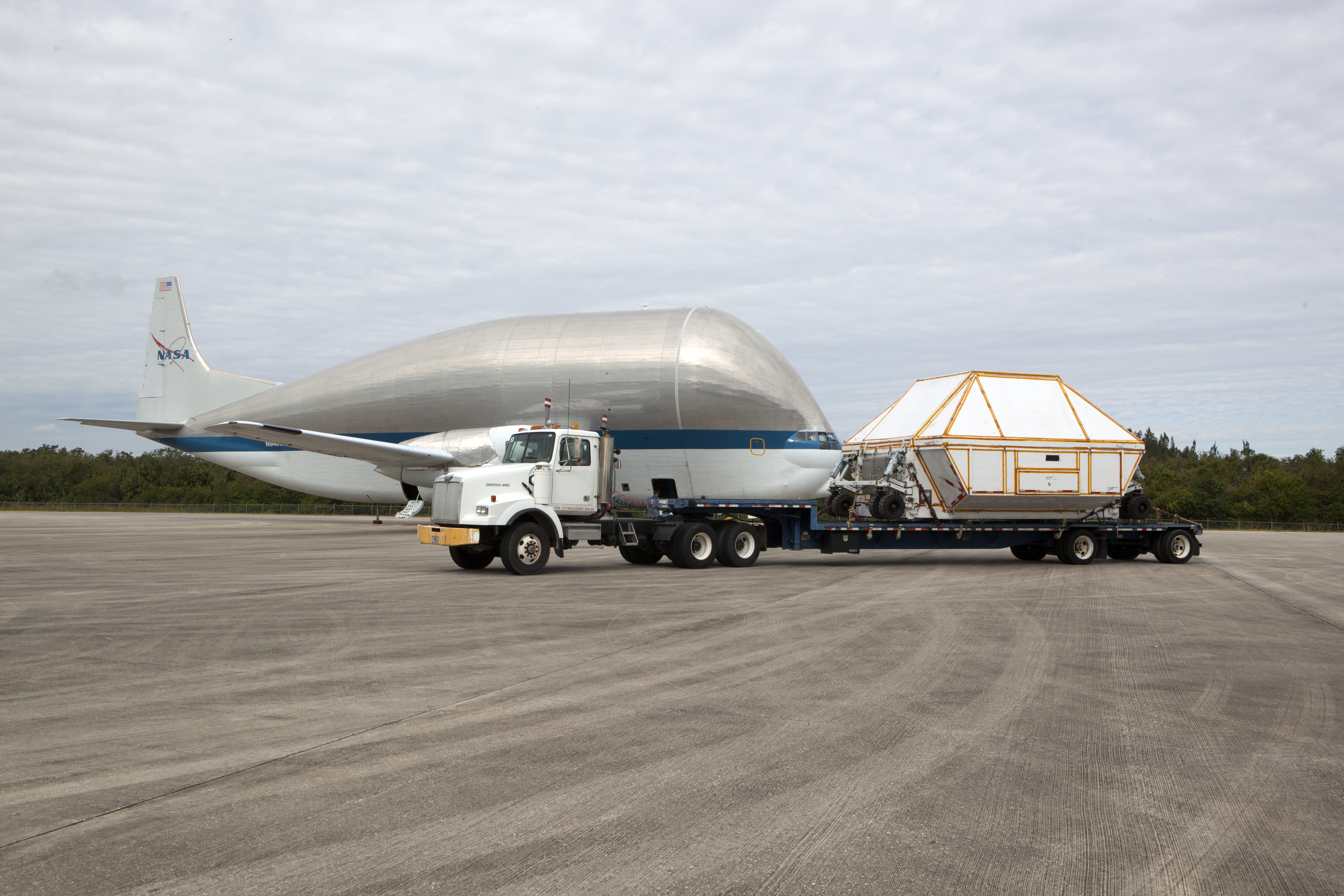 After arriving at the Shuttle Landing Facility operated by Space Florida at NASA's Kennedy Space Center in Florida, the agency's Super Guppy aircraft was opened and the container holding the Orion crew module structural test article (STA) was offloaded. A crane was used to lower the container for placement on a transporter. The Super Guppy has been closed. The test article will be moved to the Neil Armstrong Operations and Checkout Building high bay for further testing. The Orion spacecraft will launch atop NASA’s Space Launch System rocket on EM-1, its first deep space mission, in late 2018.