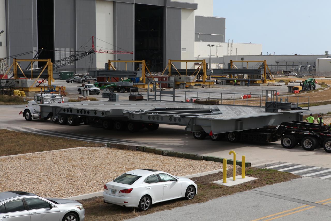 A heavy load transport truck from Tillett Heavy Hauling in Titusville, Florida, arrives at the Vehicle Assembly Building (VAB) at NASA’s Kennedy Space Center in Florida, carrying the first half of the A-level work platforms, A south, for the agency’s Space Launch System (SLS) rocket. The A-level platforms are the topmost platforms for High Bay 3 in the Vehicle Assembly Building (VAB). The platform will be delivered to the VAB staging area in the west parking lot. The Ground Systems Development and Operations Program is overseeing upgrades and modifications to High Bay 3 to support processing of the SLS and Orion spacecraft. A total of 10 levels of new platforms, 20 platform halves altogether, will surround the SLS rocket and Orion spacecraft and provide access for testing and processing.