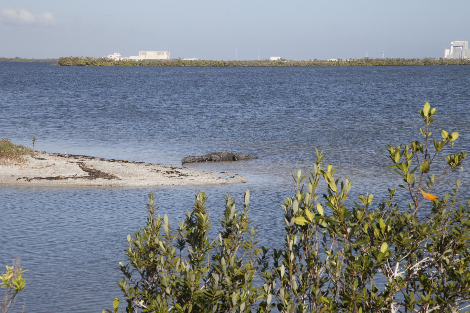 A large alligator basks in the intercoastal waterway near the NASA Causeway at Kennedy Space Center in Florida. The center shares a boundary with the Merritt Island National Wildlife Refuge. The refuge is home to more than 65 amphibian and reptile species, along with 330 native and migratory bird species, 25 mammal and 117 fish species.