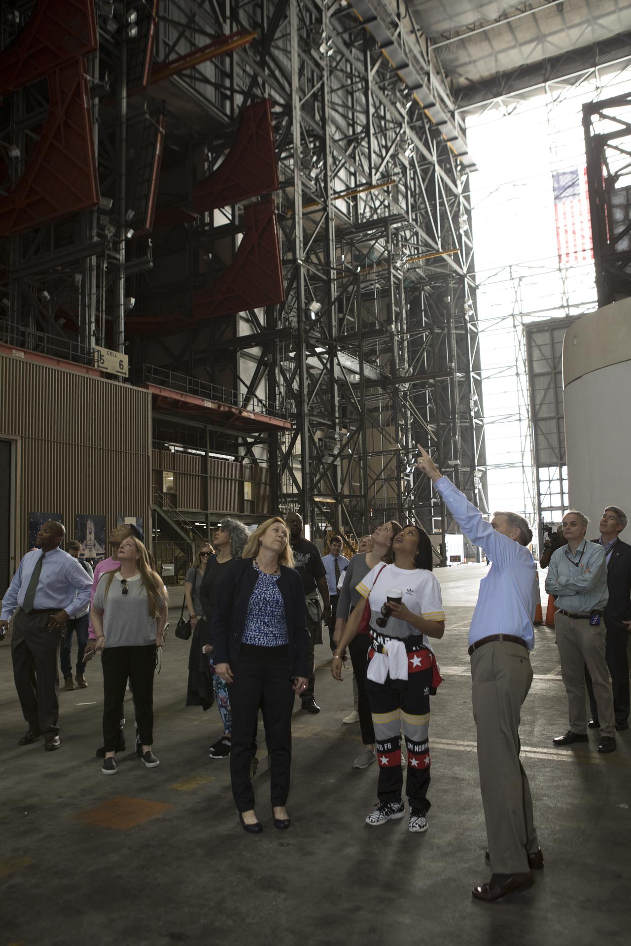 Kennedy Space Center Director Bob Cabana (pointing) provides a tour for cast and crew members of the upcoming motion picture "Hidden Figures." The group is walking thought the transfer aisle of the Vehicle Assembly Building. The movie is based on the book of the same title, by Margot Lee Shetterly. It chronicles the lives of Katherine Johnson, Dorothy Vaughan and Mary Jackson, three African-American women who worked for NASA as human "computers.” Their mathematical calculations were crucial to the success of Project Mercury missions including John Glenn’s orbital flight aboard Friendship 7 in 1962. The film is due in theaters in January 2017.