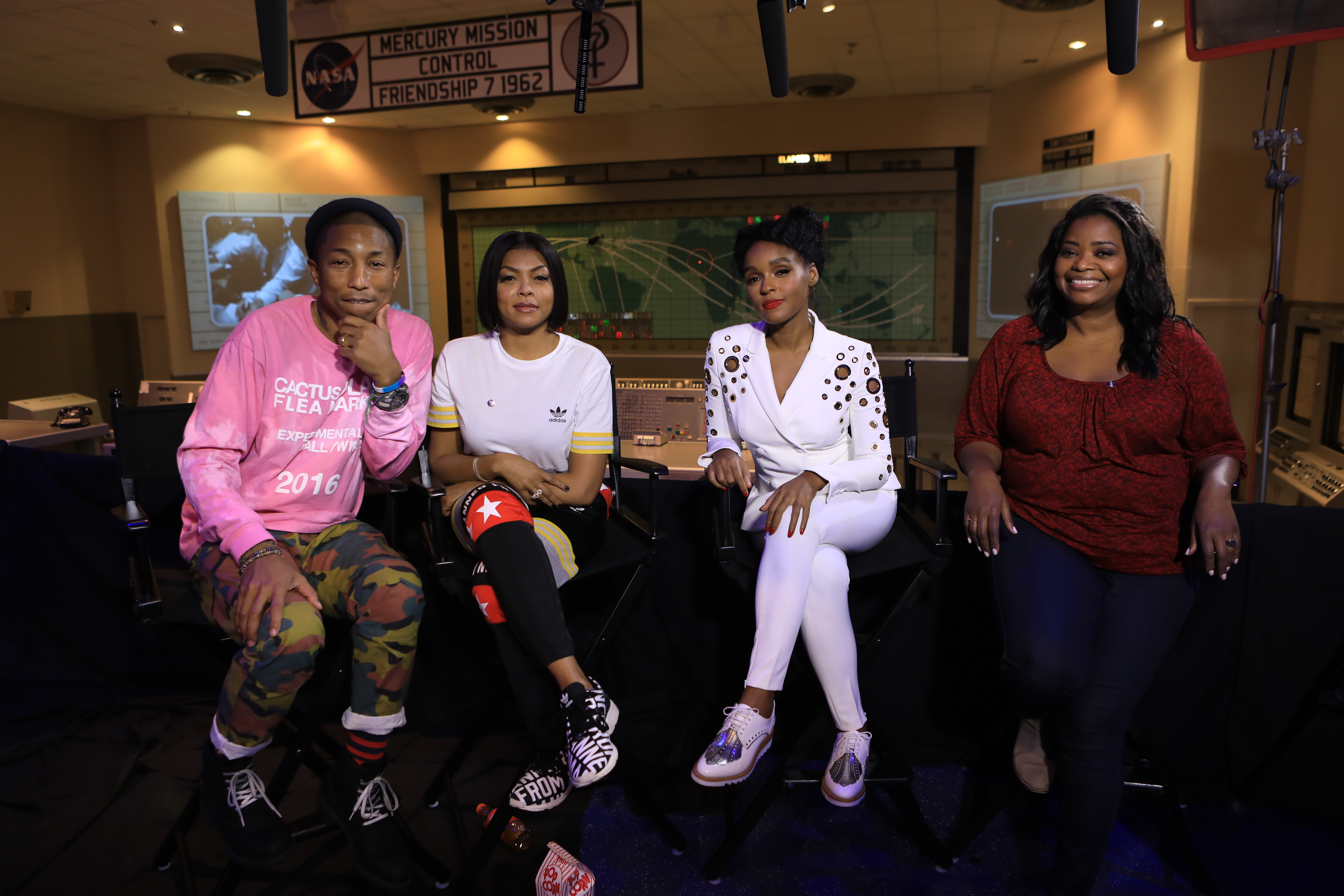 Cast and crew members of the upcoming motion picture "Hidden Figures" participate in a question and answer session at the Kennedy Space Center Visitor Complex. From the left are Pharrell Williams, musician and producer of “Hidden Figures," Taraji P. Henson, who portrays Katherine Johnson in the film, Janelle Monáe, who portrays Mary Jackson, and Octavia Spencer, who portrays Dorothy Vaughan. They are seated in front of the original consoles of the Mercury Mission Control room with the world map that was used to follow the path of capsules between tracking stations. The movie is based on the book of the same title, by Margot Lee Shetterly. It chronicles the lives of Katherine Johnson, Dorothy Vaughan and Mary Jackson, three African-American women who worked for NASA as human "computers.” Their mathematical calculations were crucial to the success of Project Mercury missions including John Glenn’s orbital flight aboard Friendship 7 in 1962. The film is due in theaters in January 2017.