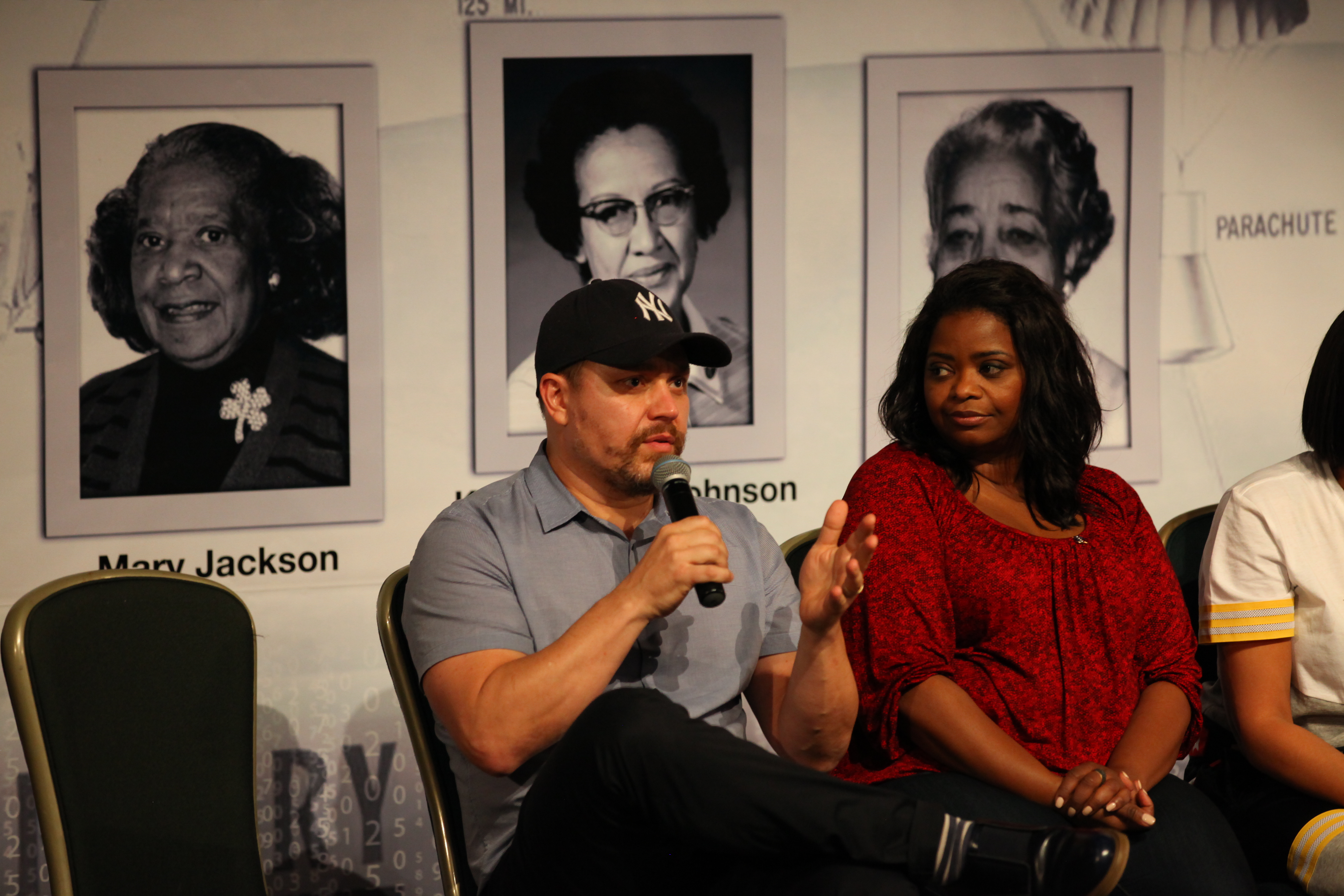 In the IMAX Theater of the Kennedy Space Center Visitor Complex Cast and crew members of the upcoming motion picture "Hidden Figures" participate in a question and answer session. From the left are Ted Melfi, writer and director of “Hidden Figures,” and Octavia Spencer, who portrays Dorothy Vaughan in the film. The movie is based on the book of the same title, by Margot Lee Shetterly. It chronicles the lives of Katherine Johnson, Dorothy Vaughan and Mary Jackson, three African-American women who worked for NASA as human "computers.” Their mathematical calculations were crucial to the success of Project Mercury missions including John Glenn’s orbital flight aboard Friendship 7 in 1962. The film is due in theaters in January 2017.