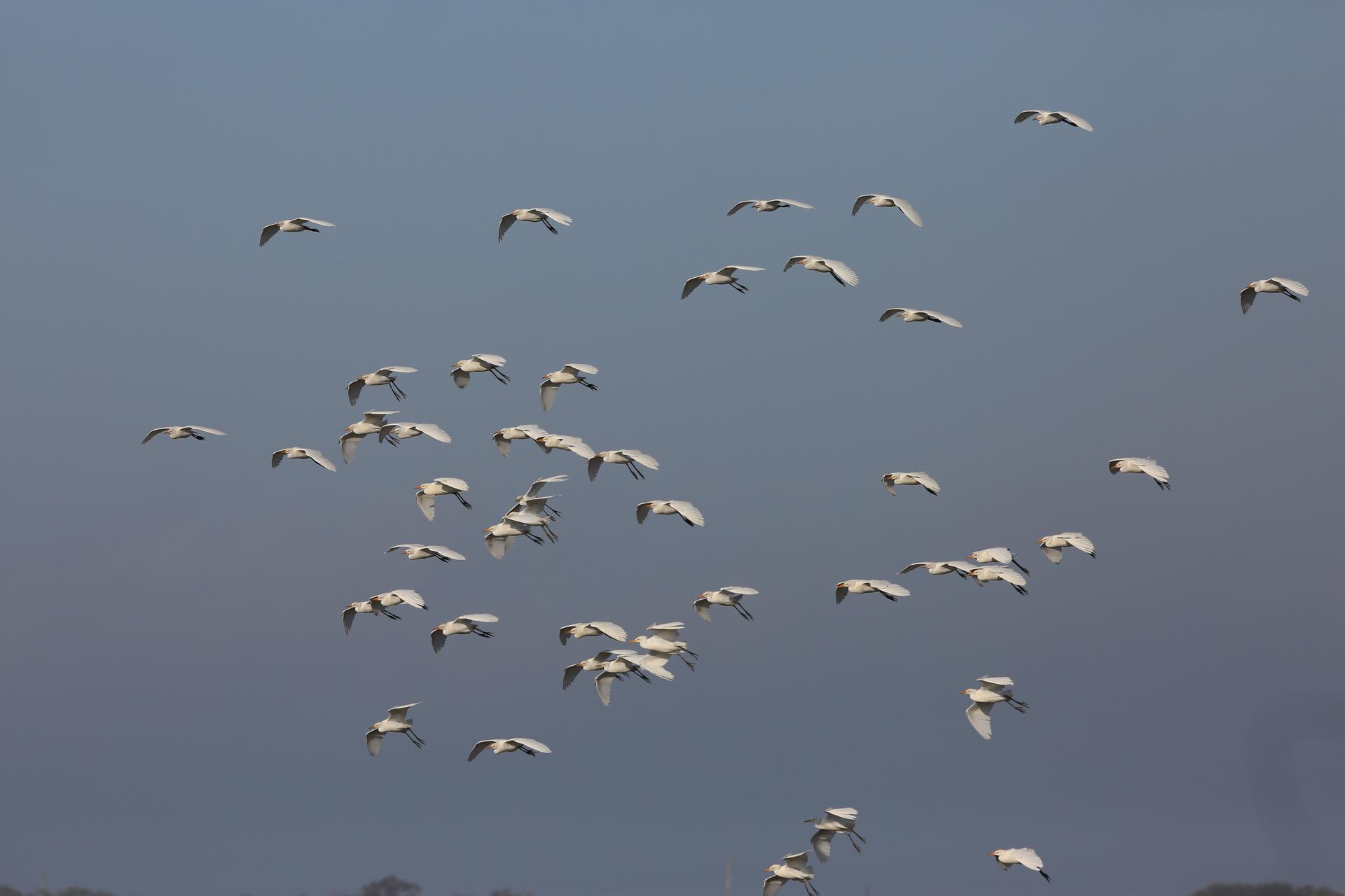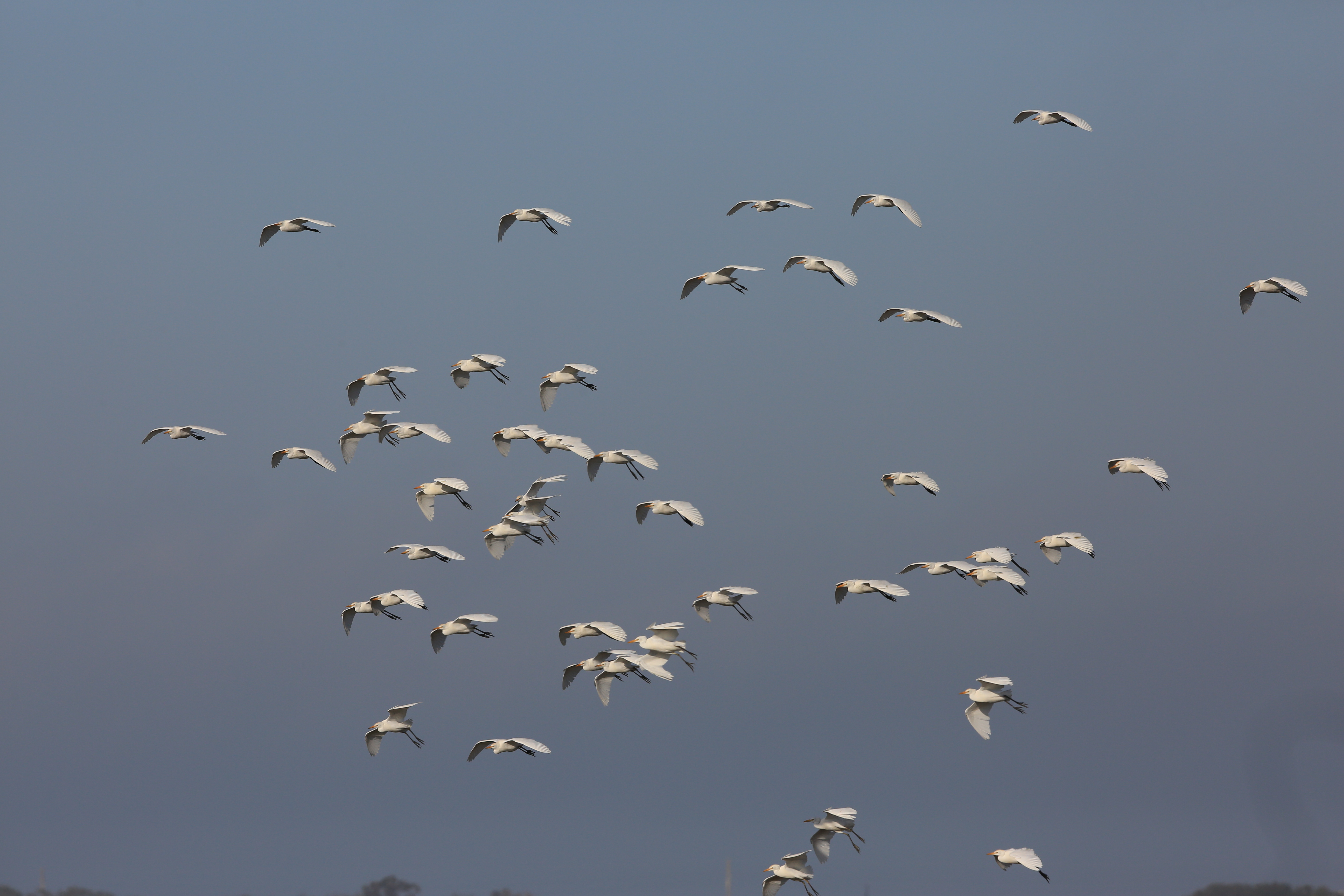 A flock of egrets soars above the Skid Strip at Cape Canaveral Air Force Station, near NASA's Kennedy Space Center in Florida. The center shares a boundary with the Merritt Island National Wildlife Refuge. The refuge is home to more than 65 amphibian and reptile species, along with 330 native and migratory bird species, 25 mammal and 117 fish species.