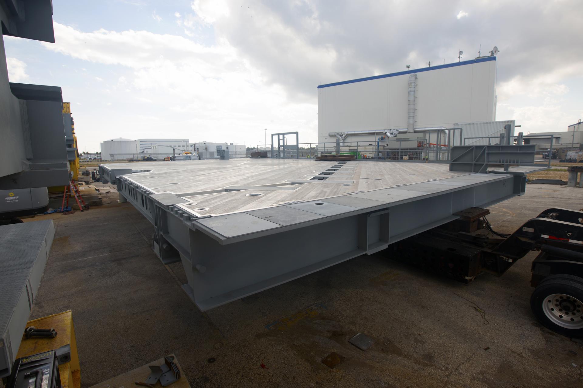 A heavy load transport truck from Tillett Heavy Hauling in Titusville, Florida, arrives in a staging area near the Vehicle Assembly Building (VAB) at NASA’s Kennedy Space Center in Florida, carrying the second half of the A-level work platforms, A north, for the agency’s Space Launch System (SLS) rocket. This is the final platform delivered to Kennedy. The A-level platforms are the topmost platforms for High Bay 3 in the Vehicle Assembly Building (VAB). The platform will be delivered to the VAB staging area in the west parking lot. The Ground Systems Development and Operations Program is overseeing upgrades and modifications to High Bay 3 to support processing of the SLS and Orion spacecraft. A total of 10 levels of new platforms, 20 platform halves altogether, will surround the SLS rocket and Orion spacecraft and provide access for testing and processing.
