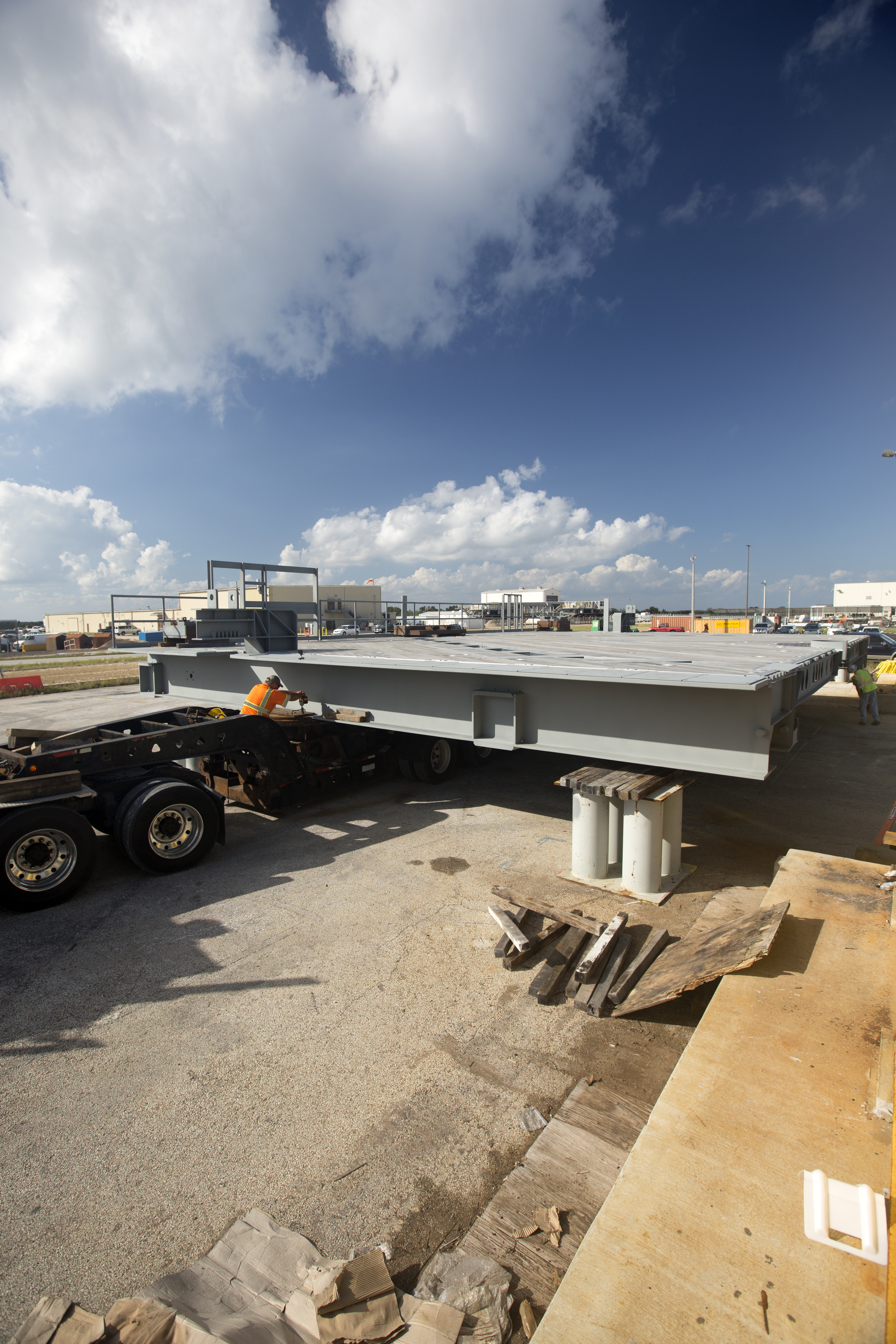Blue sky and fluffy clouds serve as the backdrop for the arrival of the second half of the A-level work platforms, A north, for the NASA's Space Launch System (SLS) rocket near the Vehicle Assembly Building (VAB) at NASA's Kennedy Space Center in Florida. Workers prepare to offload the platform from a heavy load transport truck from Tillett Heavy Hauling in Titusville, Florida, to a staging area near the VAB. This is the final platform delivered to Kennedy. The A-level platforms are the topmost platforms for High Bay 3 in the Vehicle Assembly Building (VAB). The Ground Systems Development and Operations Program is overseeing upgrades and modifications to High Bay 3 to support processing of the SLS and Orion spacecraft. A total of 10 levels of new platforms, 20 platform halves altogether, will surround the SLS rocket and Orion spacecraft and provide access for testing and processing.