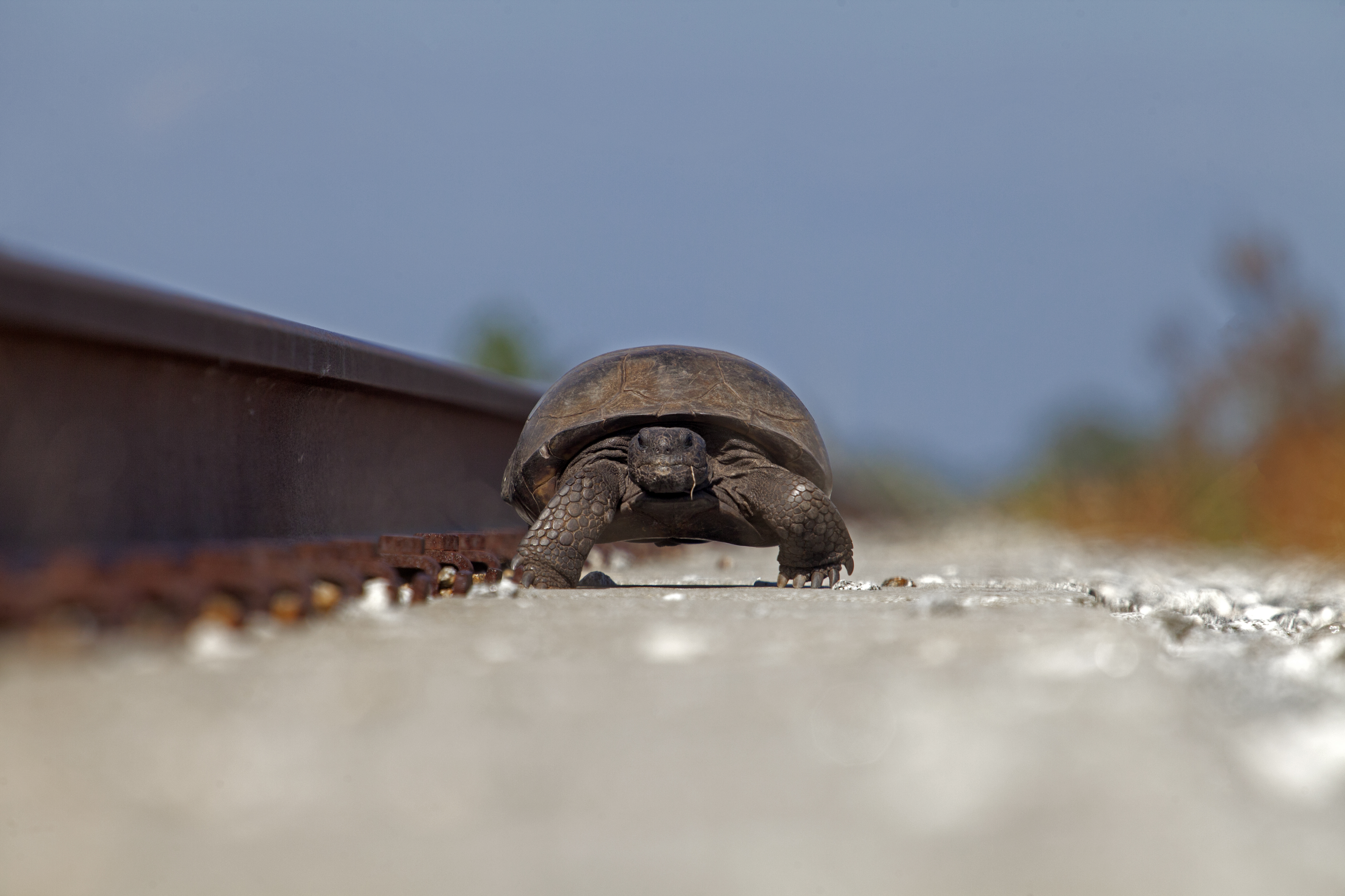 A turtle lumbers along on the sand near railroad tracks at NASA's Kennedy Space Center in Florida. The center shares a border with the Merritt Island National Wildlife Refuge. More than 330 native and migratory bird species, 25 mammals, 117 fishes and 65 amphibians and reptiles call Kennedy and the wildlife refuge home.